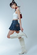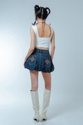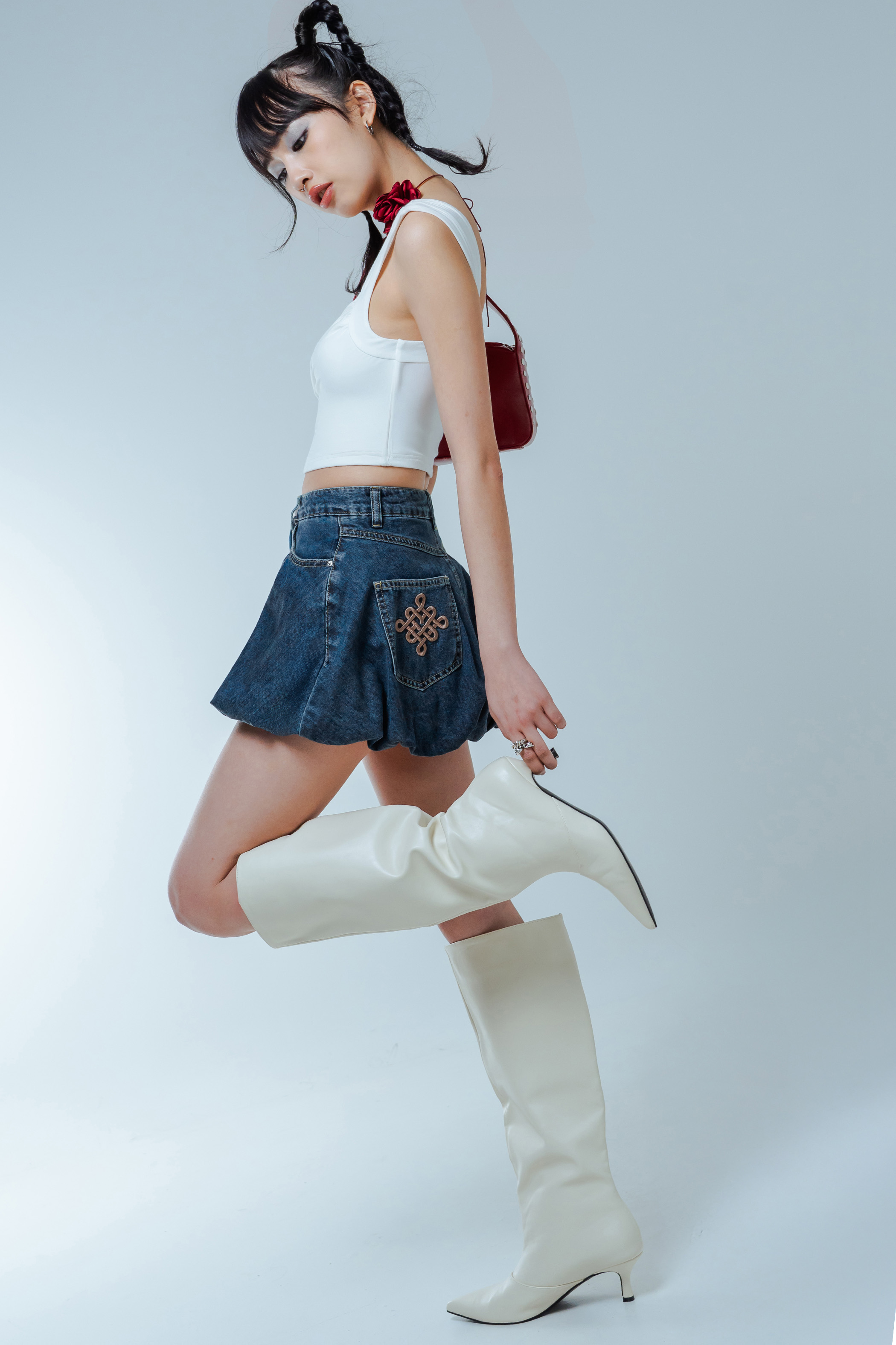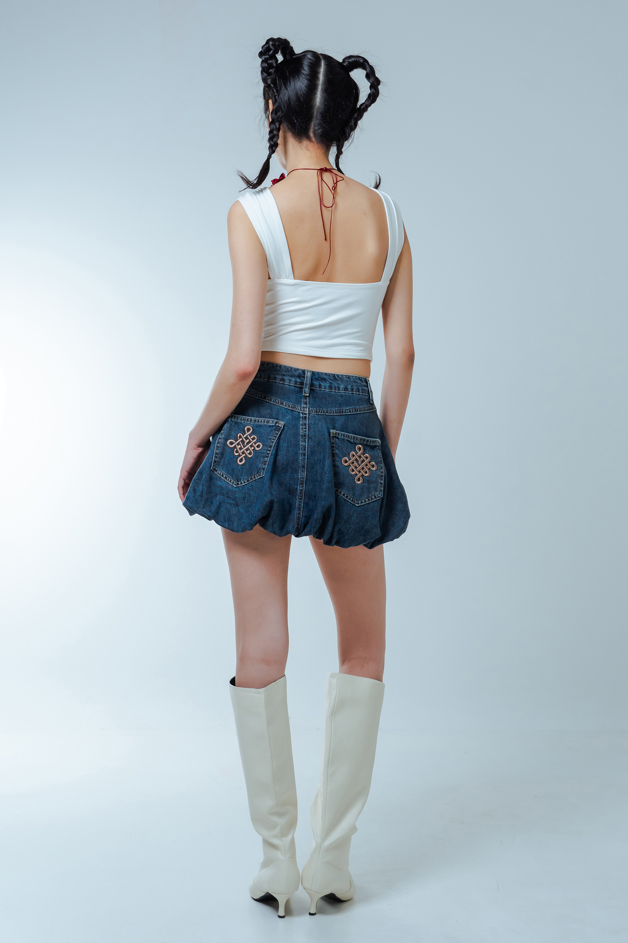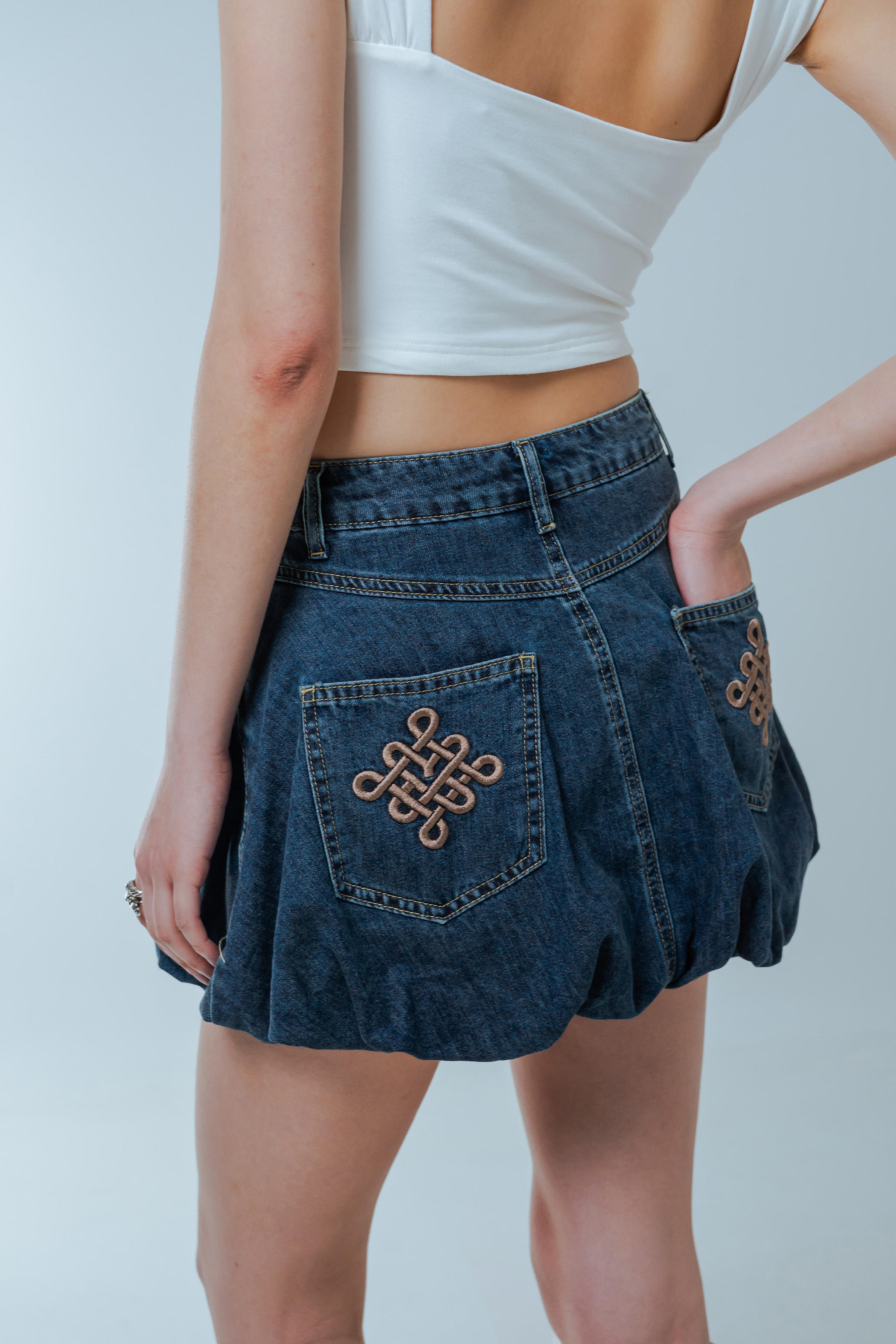 A mini with personality to spare. This bubble-shaped denim skirt flares softly with a festive spirit, while the back-pocket stitching adds a wink of detail for those who look closer. Playful yet polished, it is the skirt that turns a simple moment into something a little more memorable.