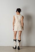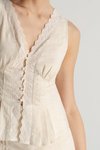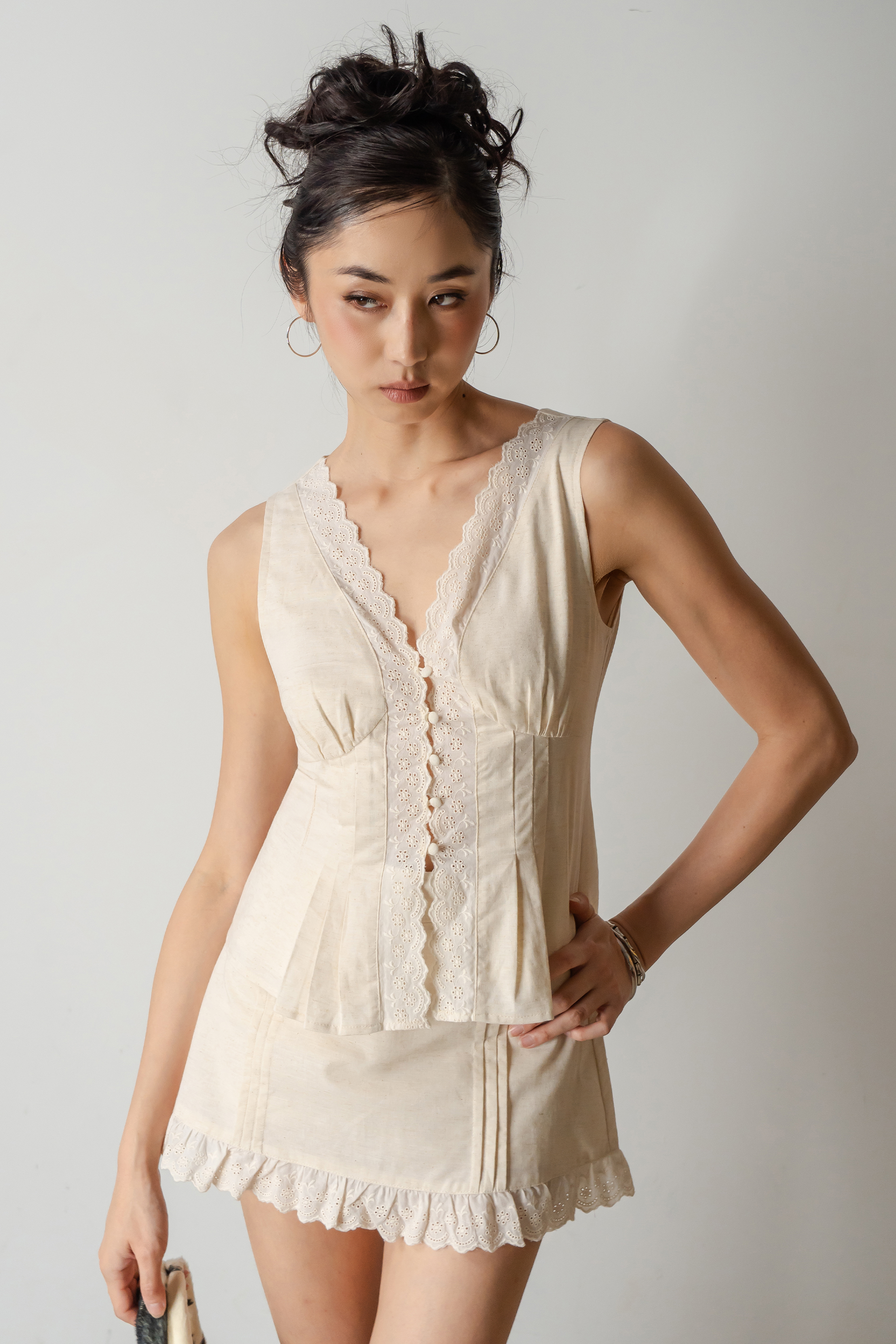 The Brunch Button Linen Top keeps things easy and feminine — crafted from soft linen with light padding for comfortable support. Designed with a sleeveless cut, front buttons, subtle pleated details, and a delicate lace hem, it’s a simple yet special essential. Pair it with the Weekender Pleated Linen Skirt for a perfectly coordinated, effortless look.