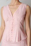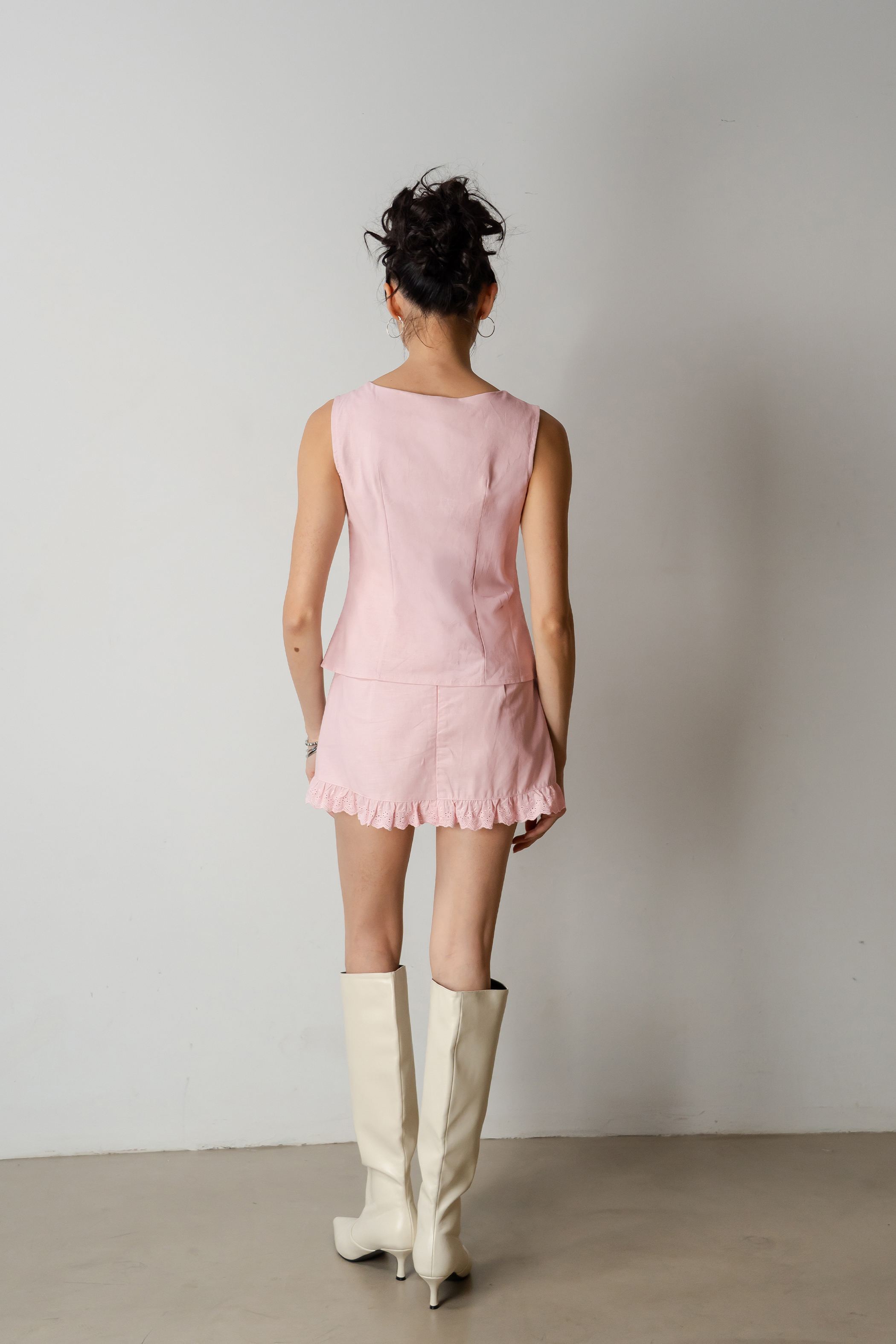 The Brunch Button Linen Top keeps things easy and feminine — crafted from soft linen with light padding for comfortable support. Designed with a sleeveless cut, front buttons, subtle pleated details, and a delicate lace hem, it’s a simple yet special essential. Pair it with the Weekender Pleated Linen Skirt for a perfectly coordinated, effortless look.