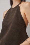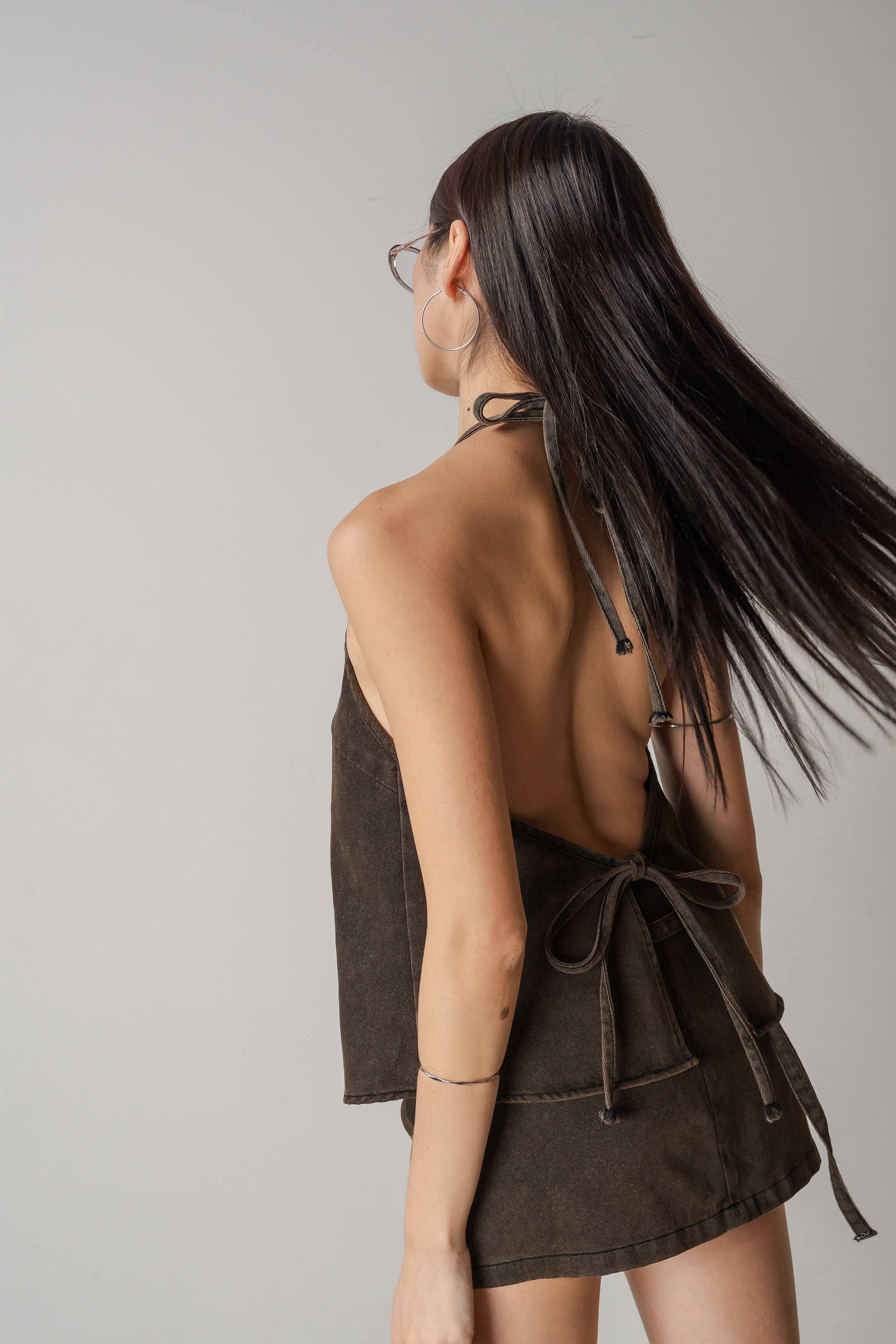 Relaxed and effortlessly cool, the Charge Denim Halter Top redefines denim with a lighter, freer feel. Designed with a halter neckline, open back, and flared hem, it drapes loosely for an easy silhouette. Padded for comfort and made to pair seamlessly with the Dart Denim Belted Skirt, it’s a fresh take on everyday denim dressing.