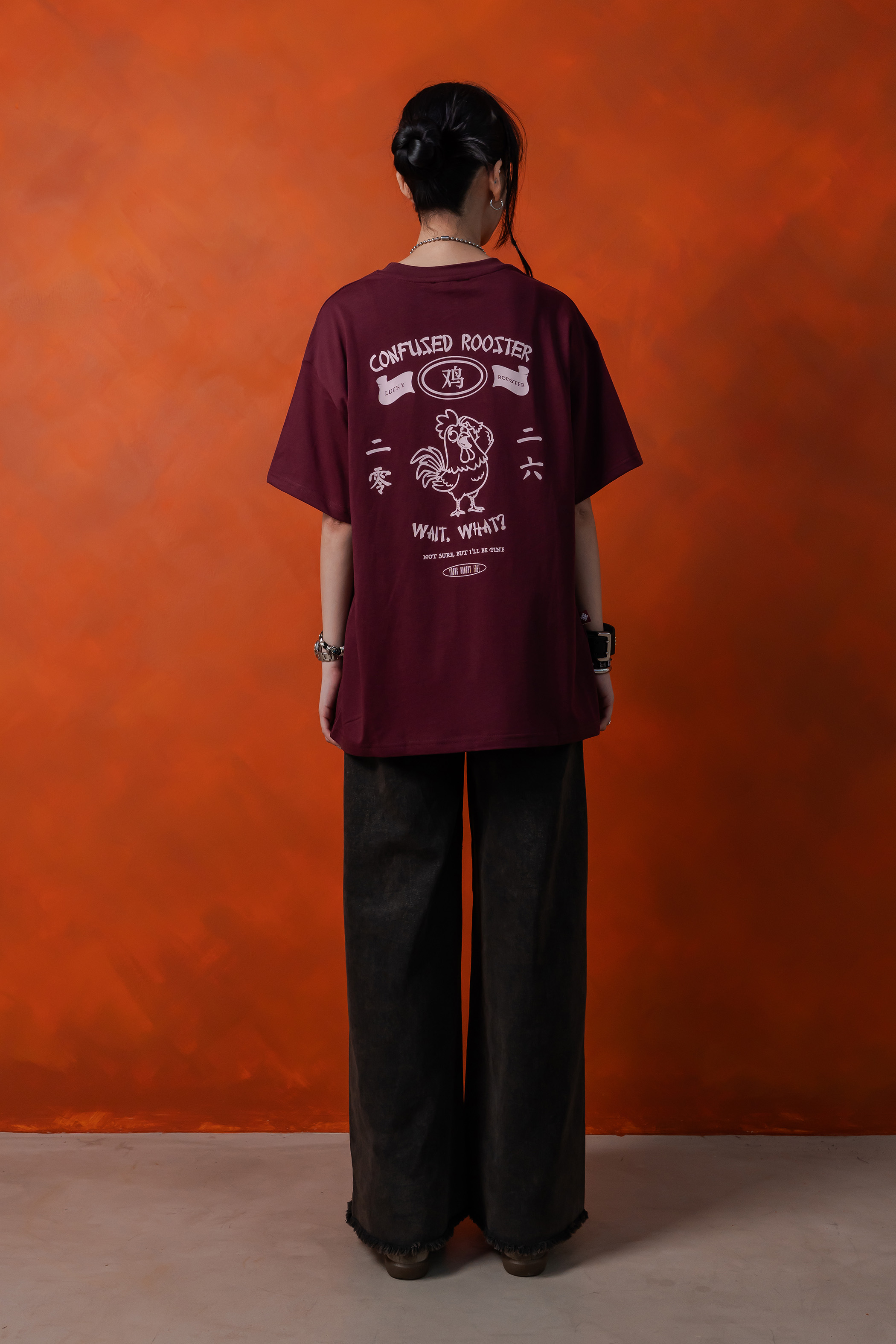 Confused Rooster Tee in Dark Carmine
