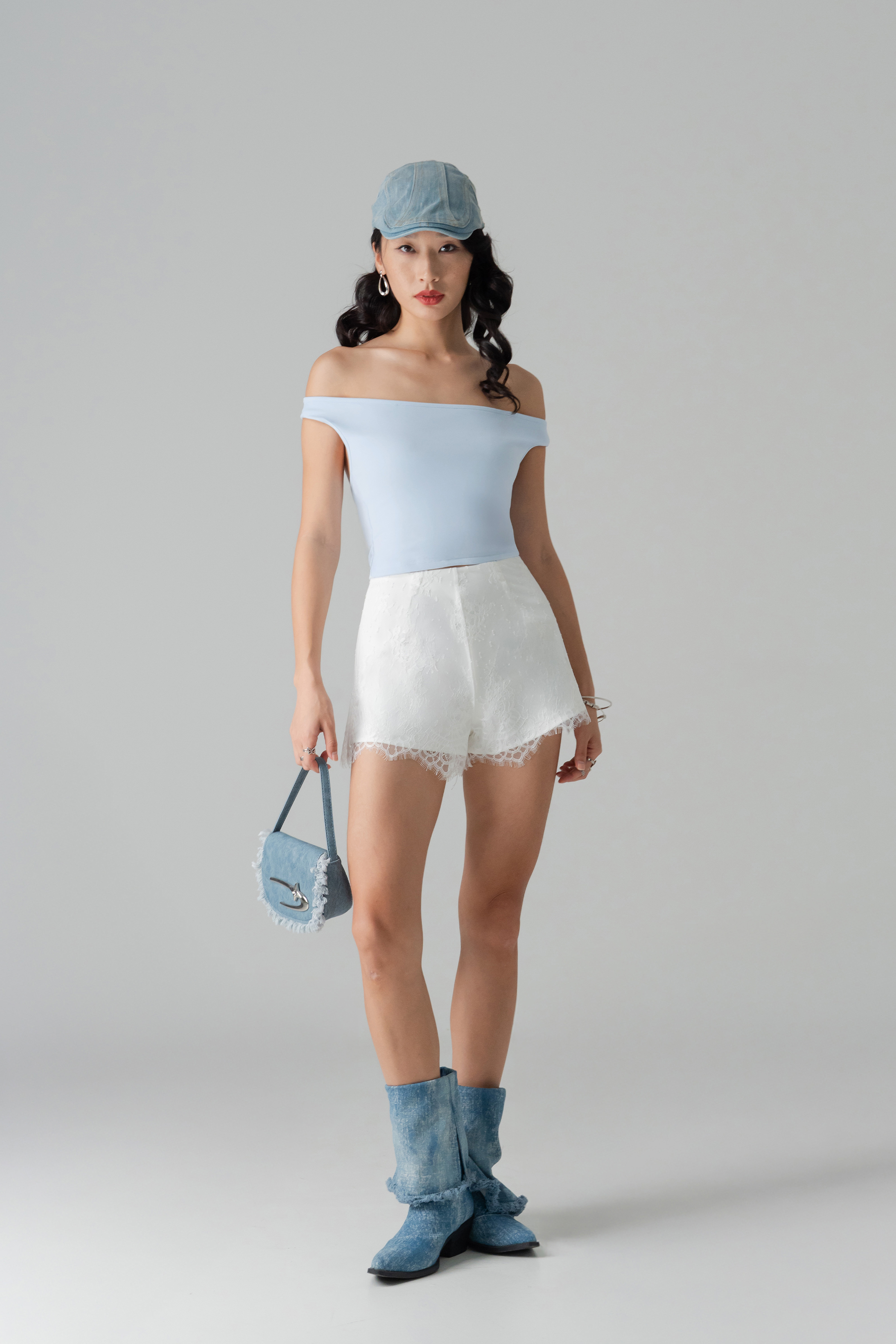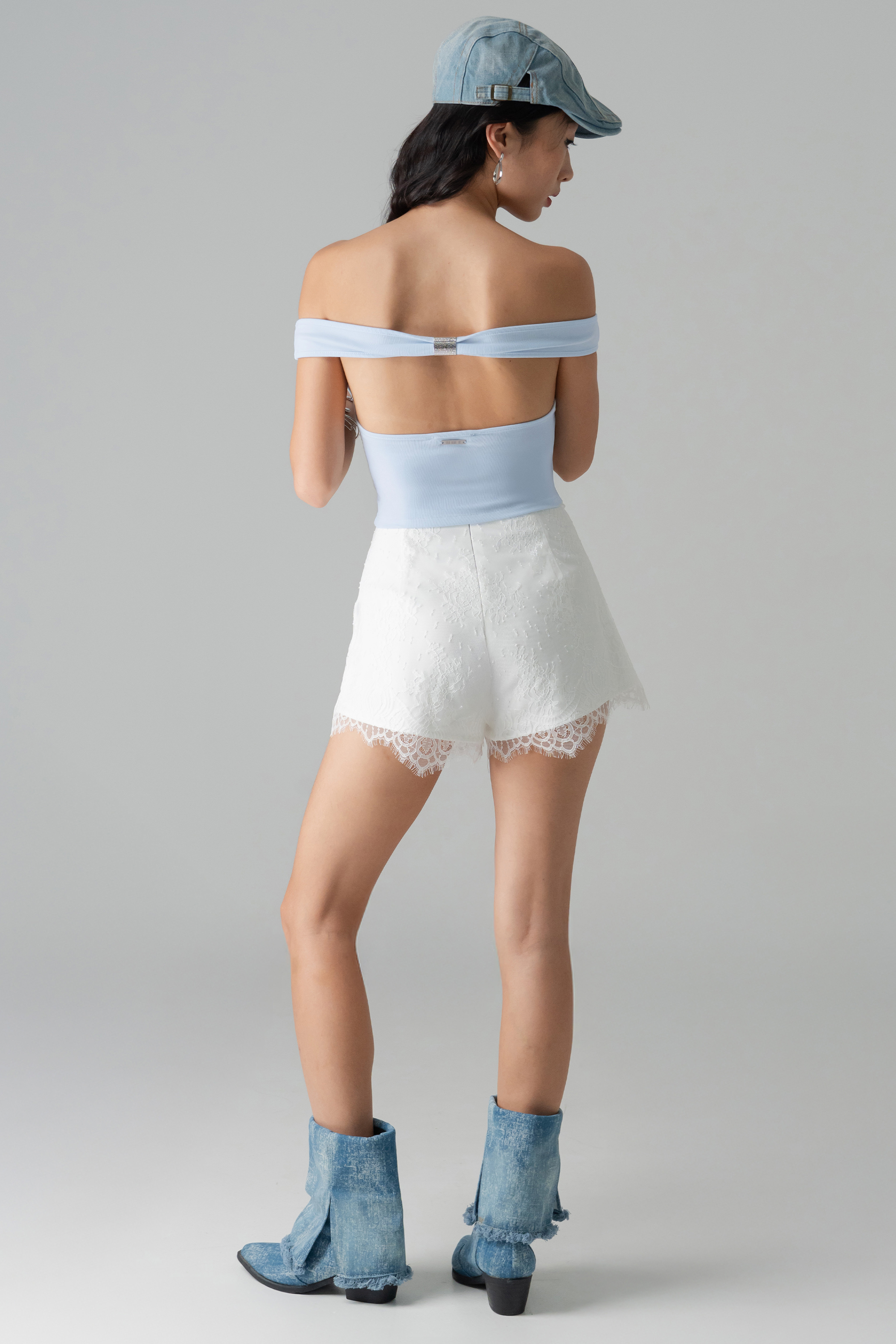 Delicate yet striking, the Coy Lace Tailored Shorts layer airy lace over a tailored flare for an elevated mini silhouette. Lightly structured, they move with a gravity-defying grace. A versatile essential that shines in every constellation of style.