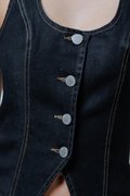 Denim gets a fresh twist in a vest that knows how to flirt with the details. The ribbon trims are detachable for styling freedom, while the halter cut and open back keep the look bold and confident. Structured yet easygoing, it’s the kind of piece that shifts effortlessly from daytime charm to night-out energy.