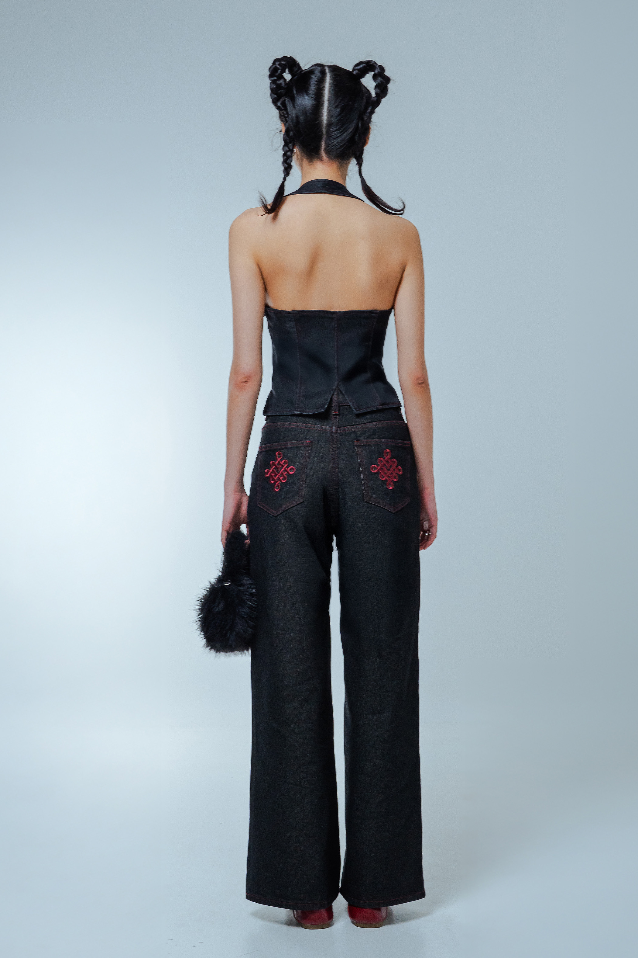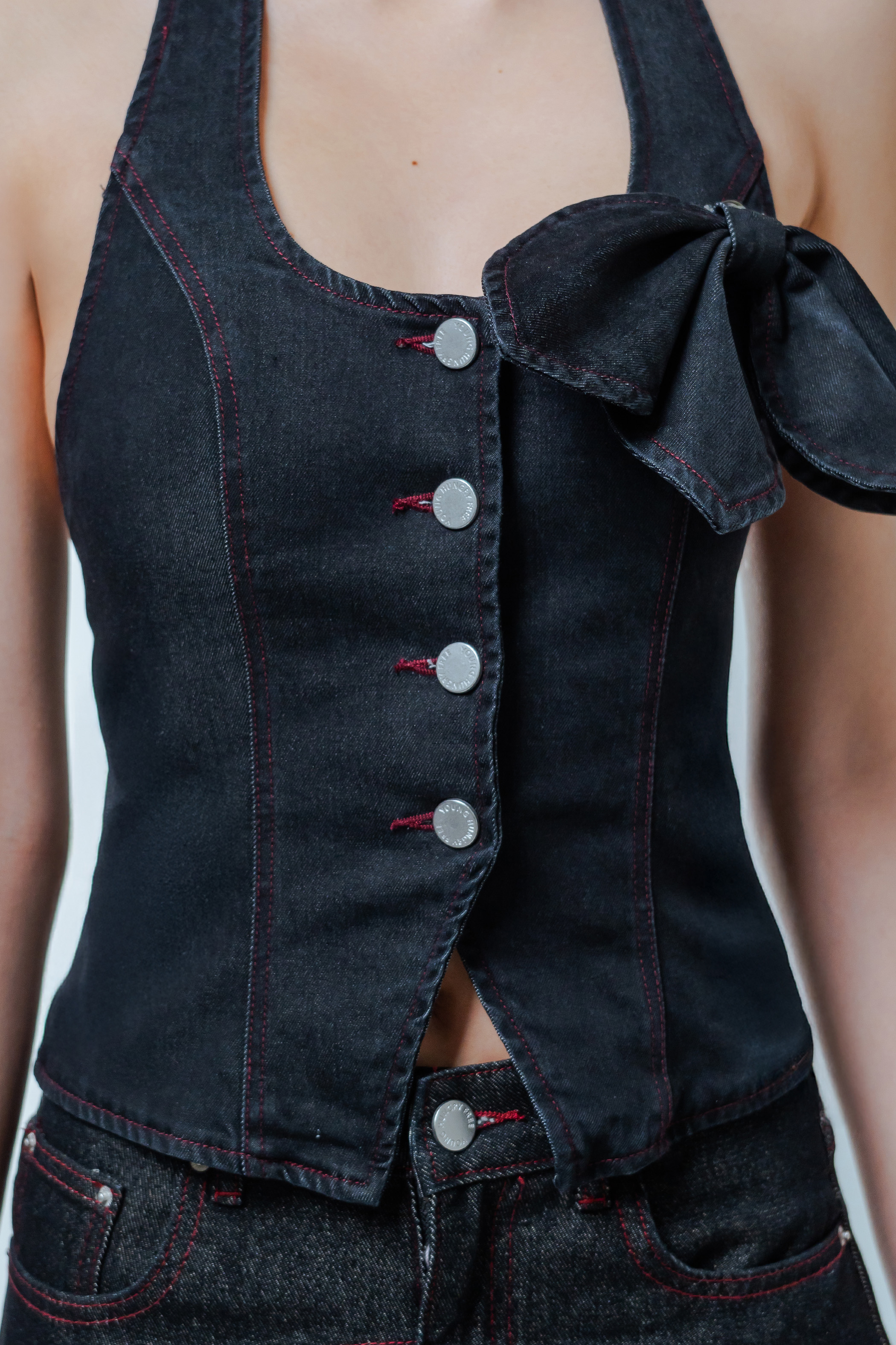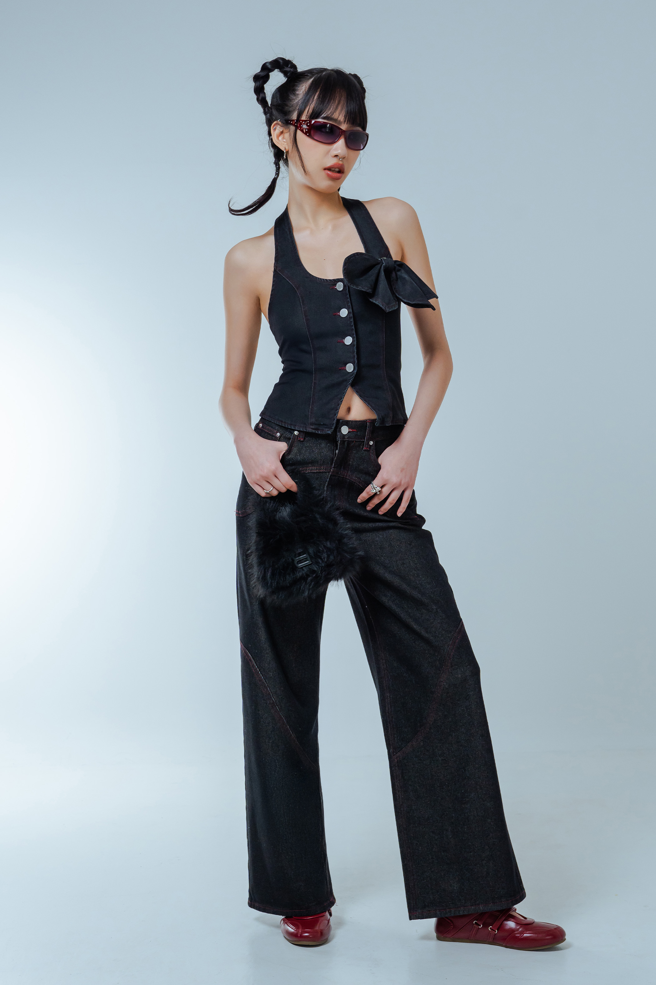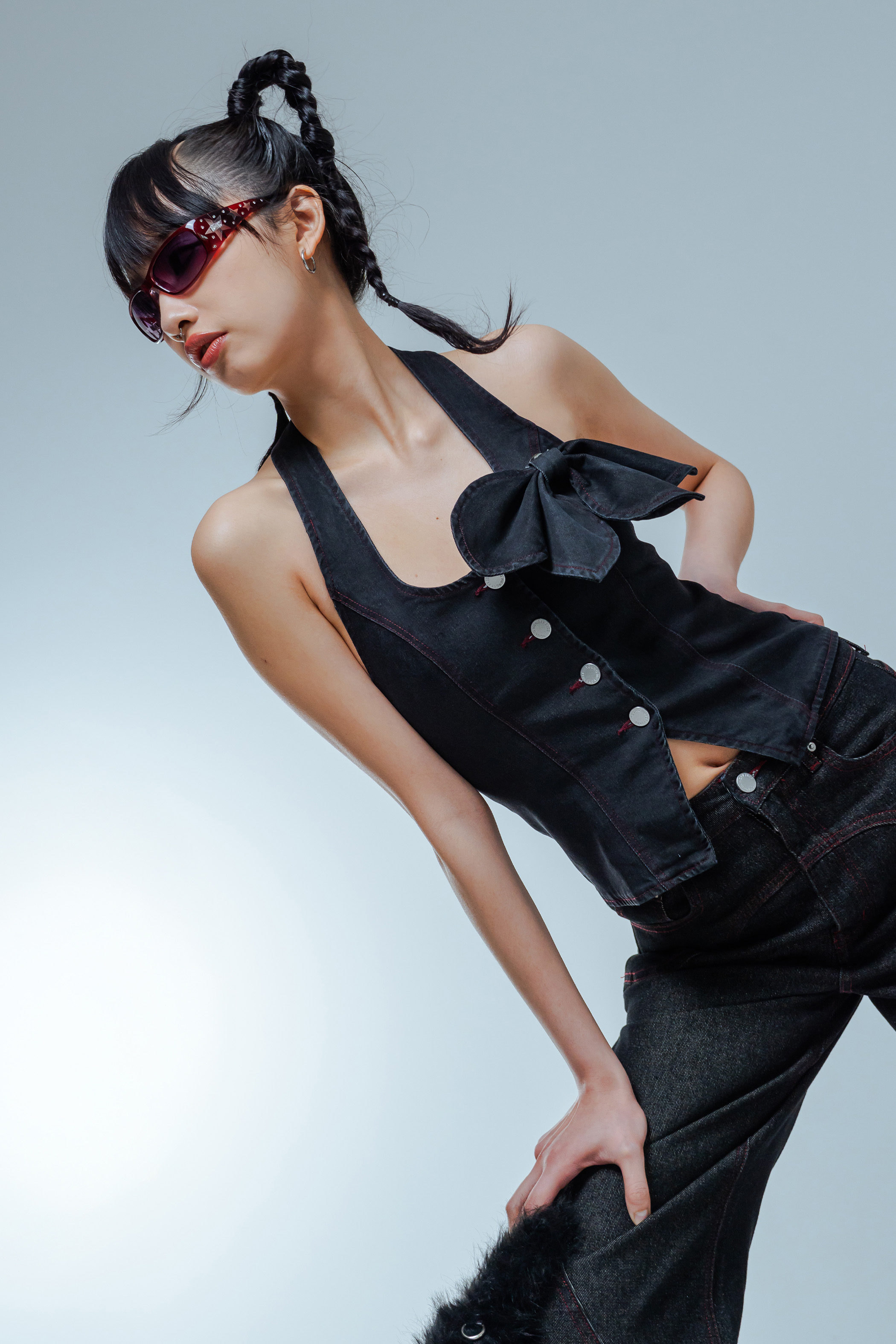 Denim gets a fresh twist in a vest that knows how to flirt with the details. The ribbon trims are detachable for styling freedom, while the halter cut and open back keep the look bold and confident. Structured yet easygoing, it’s the kind of piece that shifts effortlessly from daytime charm to night-out energy.