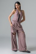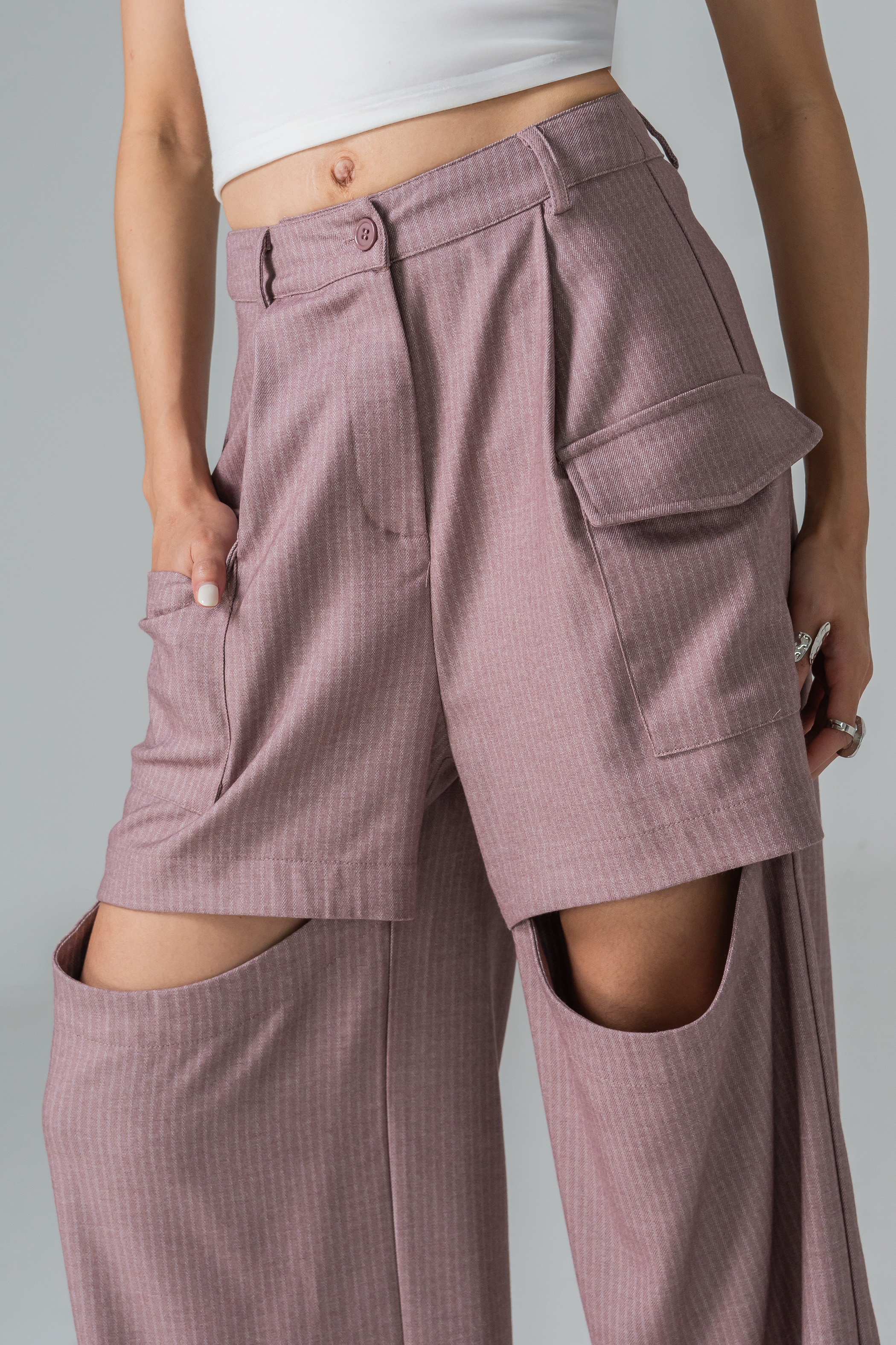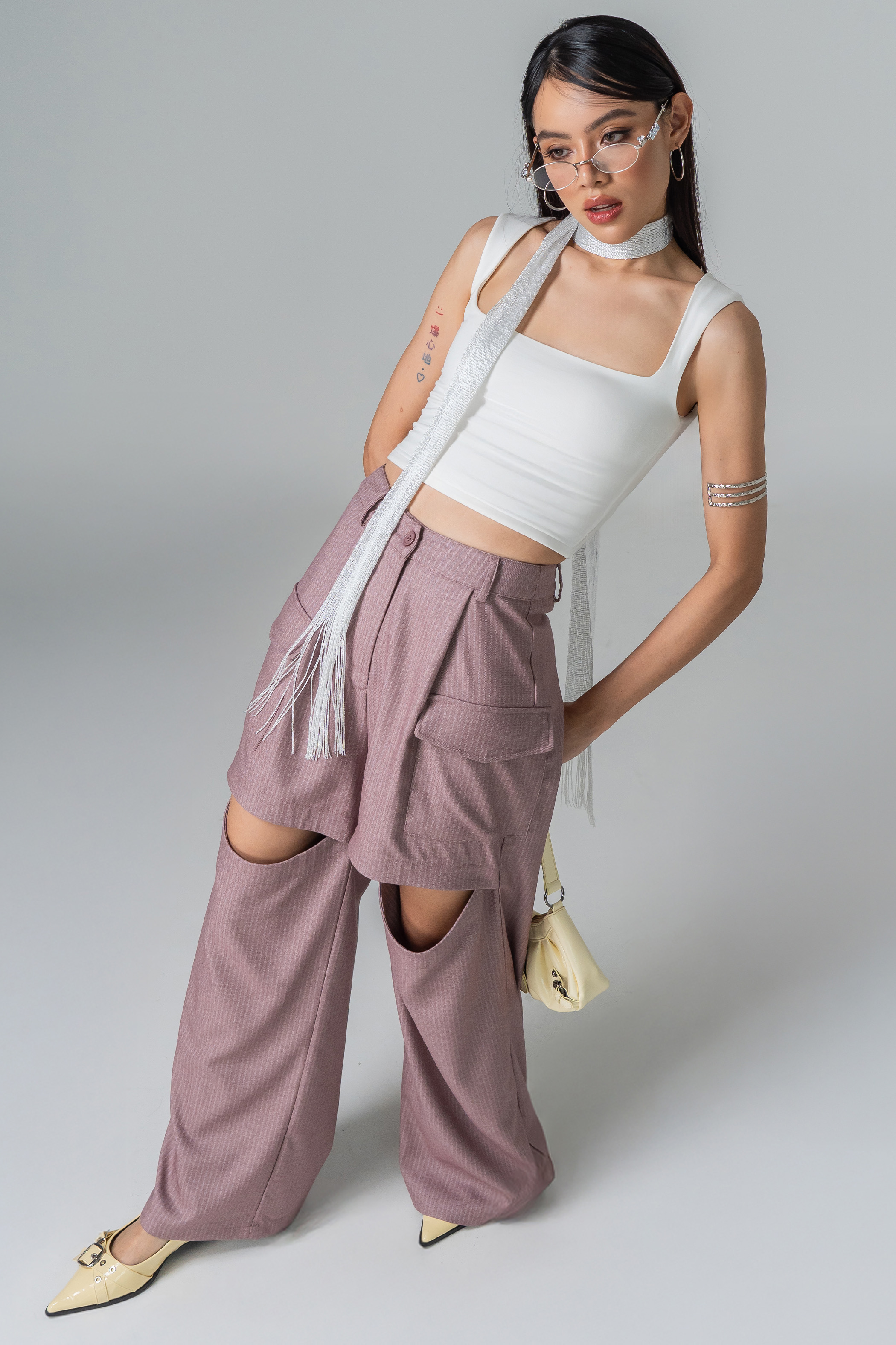 These pants carry the confidence of a city, sharp pinstripes cutting through the ordinary with every step. Knee cut-outs reveal a playful rebellion, while wide-leg flow keeps the look effortlessly refined. A modern classic made for those who command the spotlight at any celebration.