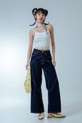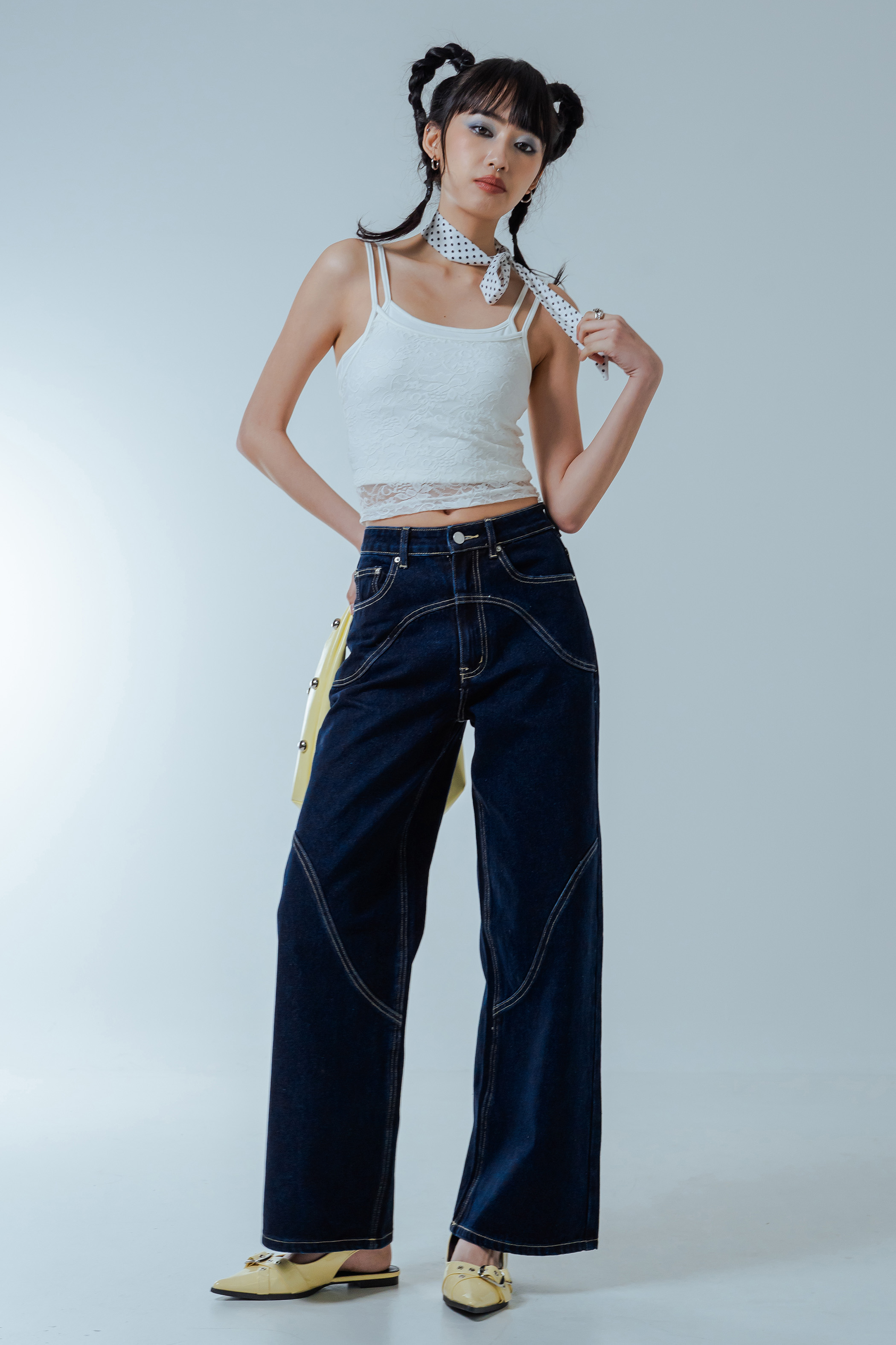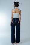 Denim that flows with quiet confidence. These straight-cut, wide-leg jeans elongate with every step, while the festive stitching at the back pocket offers a subtle nod to the season. A maxi-length silhouette that feels refined without trying — made for days that glide effortlessly into nights.
