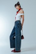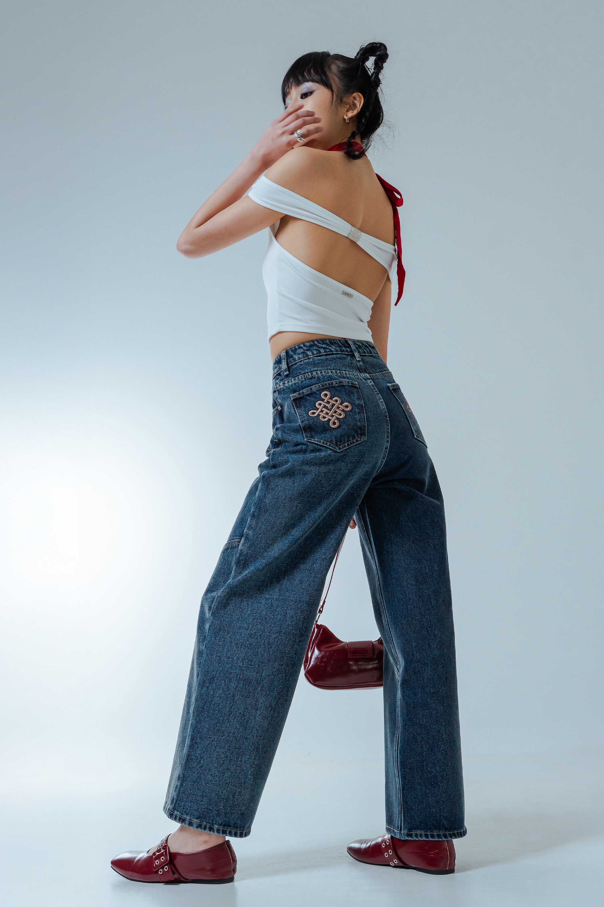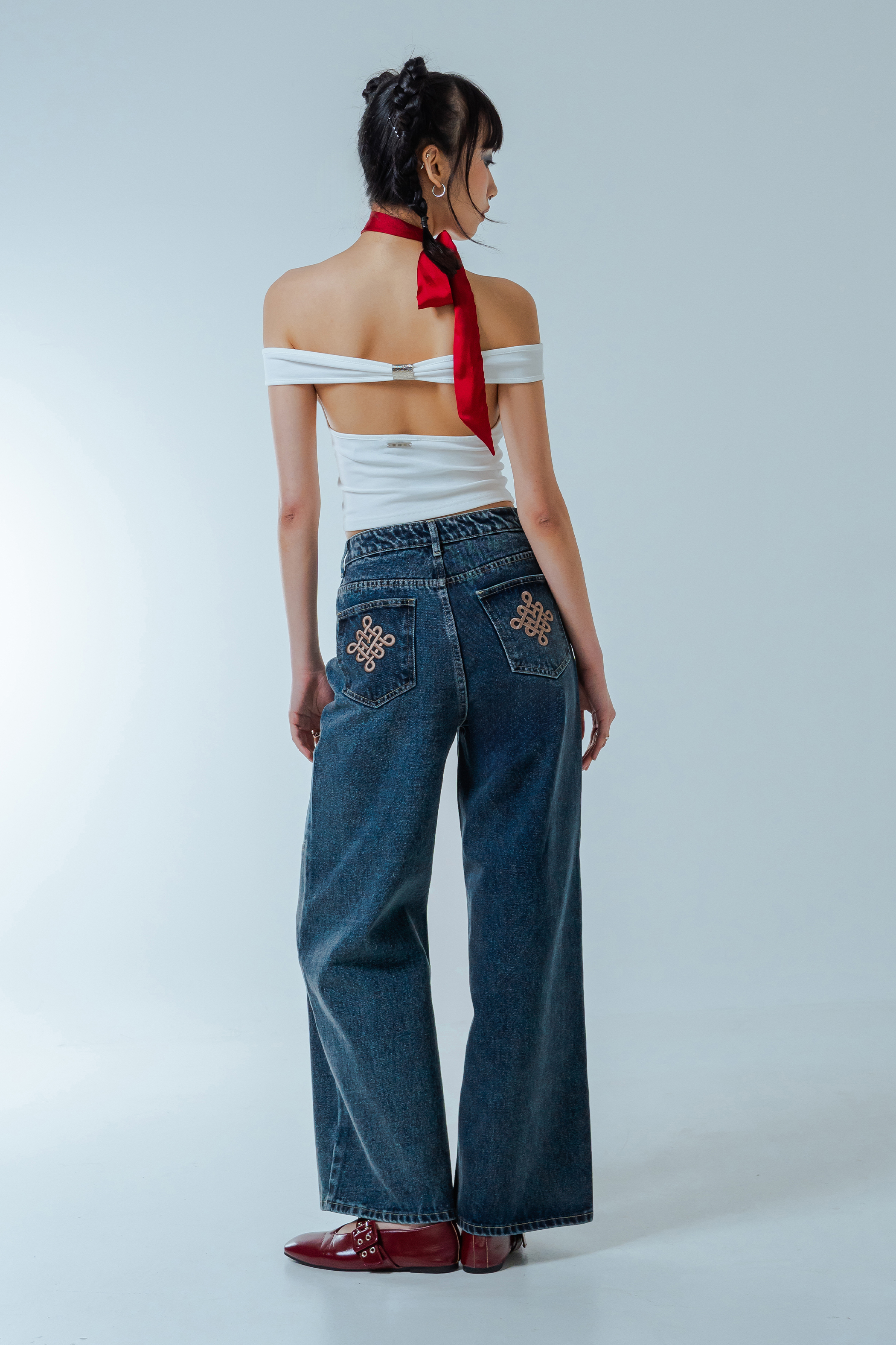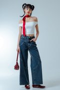 Denim that flows with quiet confidence. These straight-cut, wide-leg jeans elongate with every step, while the festive stitching at the back pocket offers a subtle nod to the season. A maxi-length silhouette that feels refined without trying — made for days that glide effortlessly into nights.