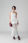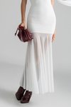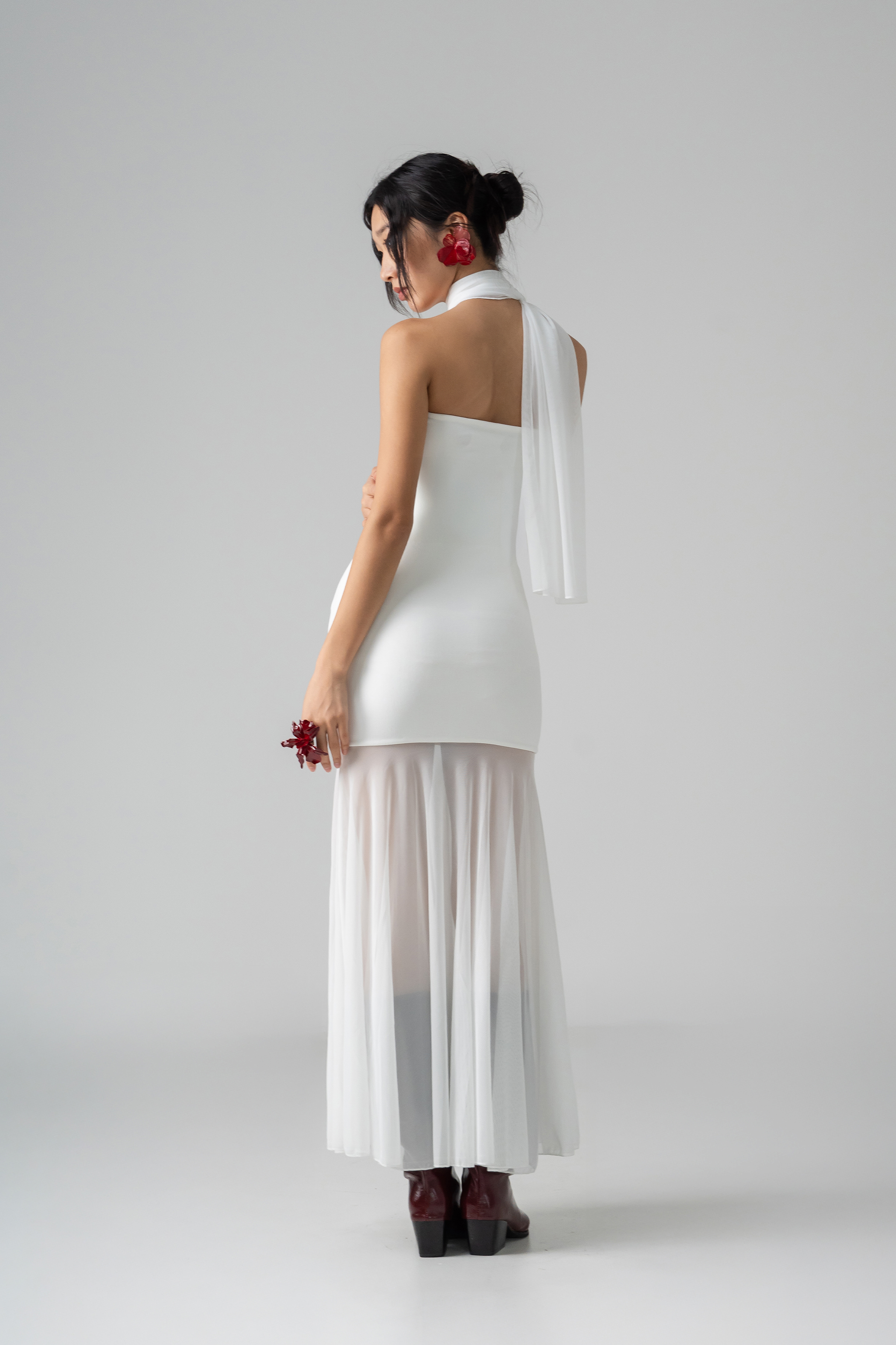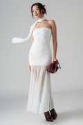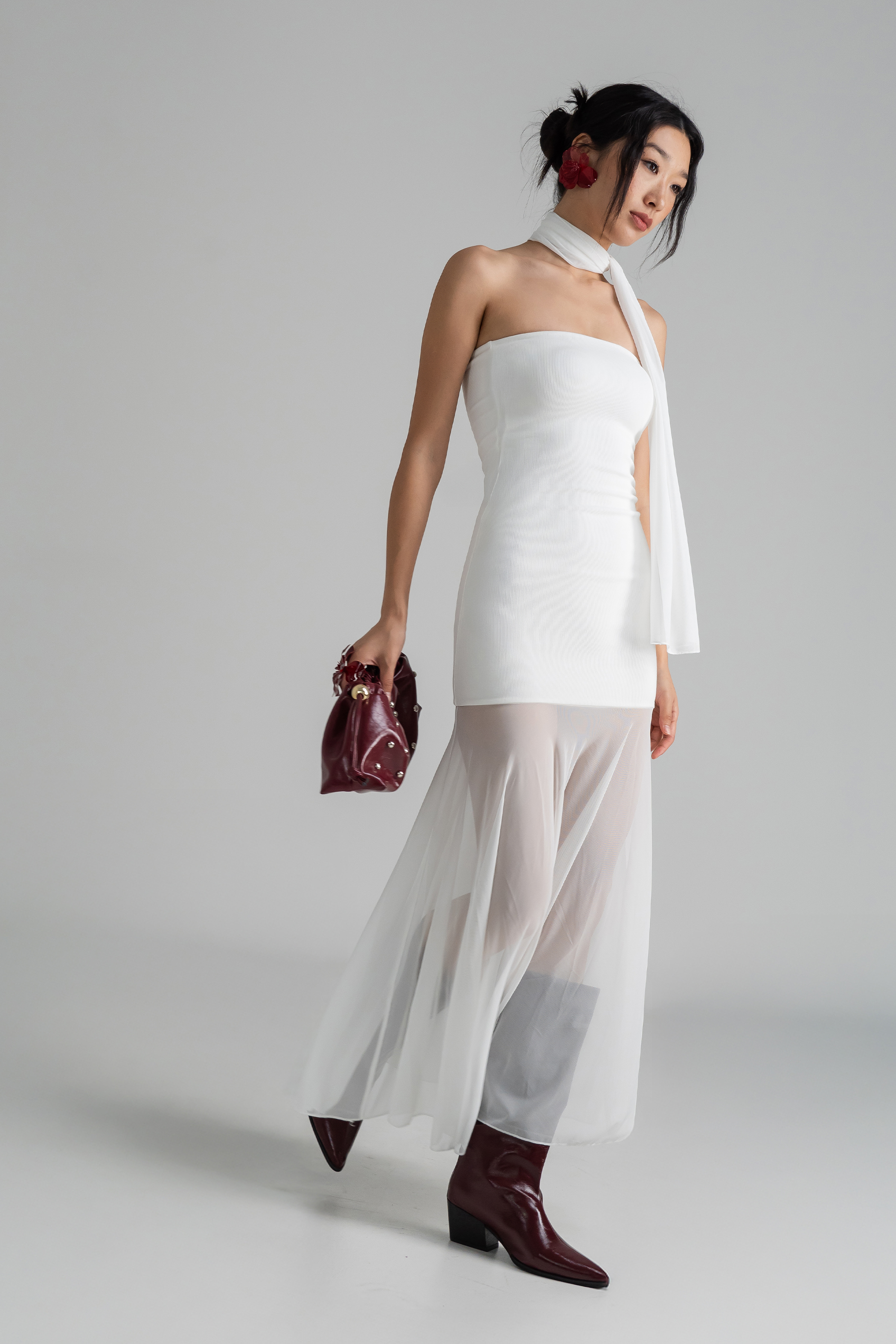 Softly romantic and made for the season, the Ethereal Mesh Maxi Dress features a tube bodice flowing into a breezy mesh skirt. The neck sash and built-in padding add subtle structure, shaping a fitted, feminine silhouette with a festive glow. A standout piece that balances dreamlike ease with refined elegance.