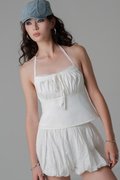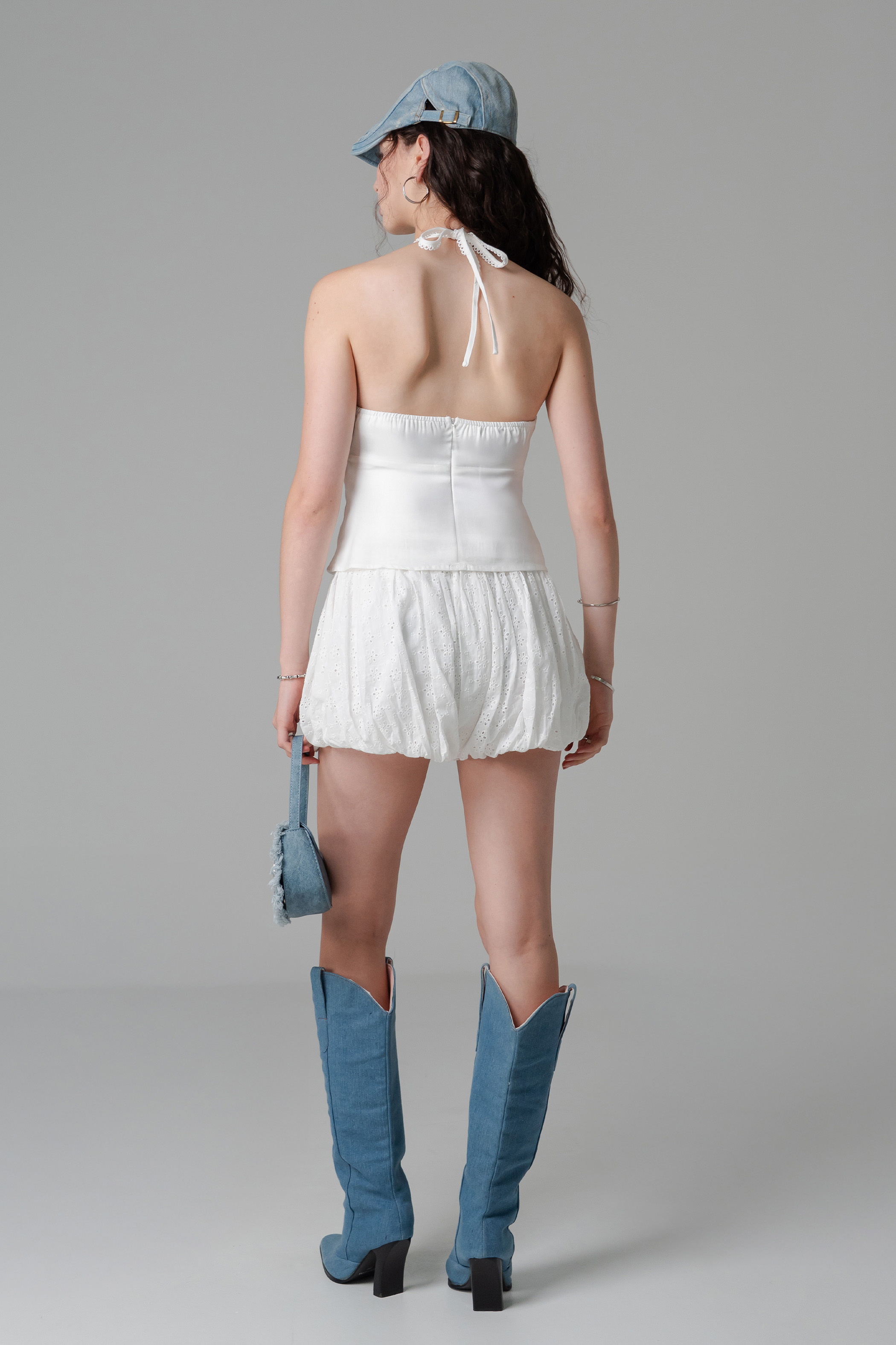 Closure: Concealed Back Zipper Straps: Self Tie Bra Recommendation: Strapless/ Stick-on Bra Padding: Removable Silhouette: Cropped |