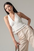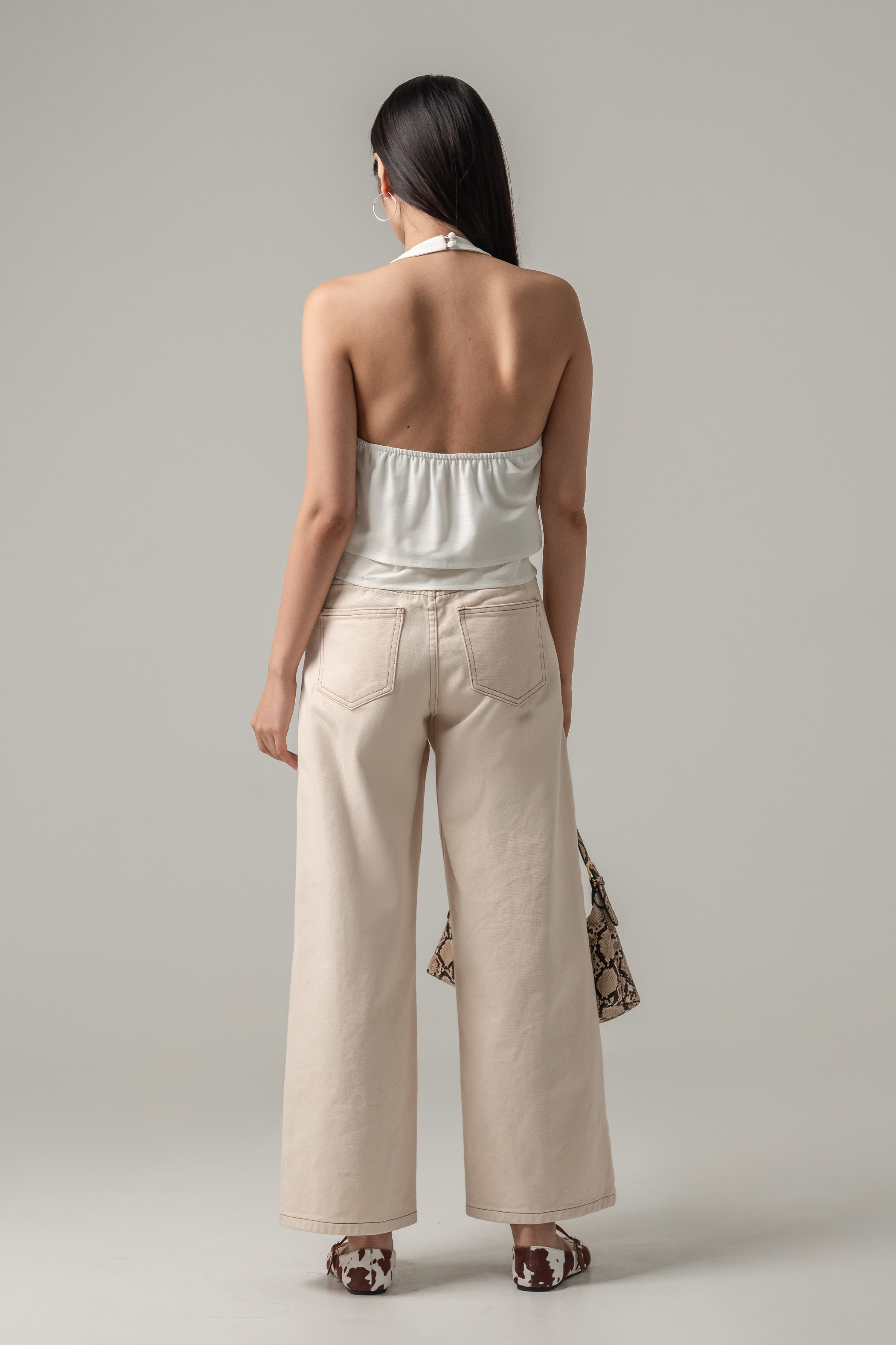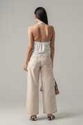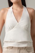 Effortless and modern, the Hung Up Layered Halter Top features a flattering V-neckline, layered front, and an open back that exudes understated allure. Light padding keeps it sleek and secure, while the halter cut highlights the shoulders beautifully. Pair it with the Cupcakes Linen Ruched Skirt for a coordinated look that’s equal parts chic and effortless.