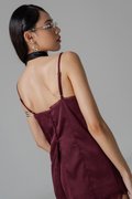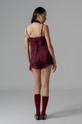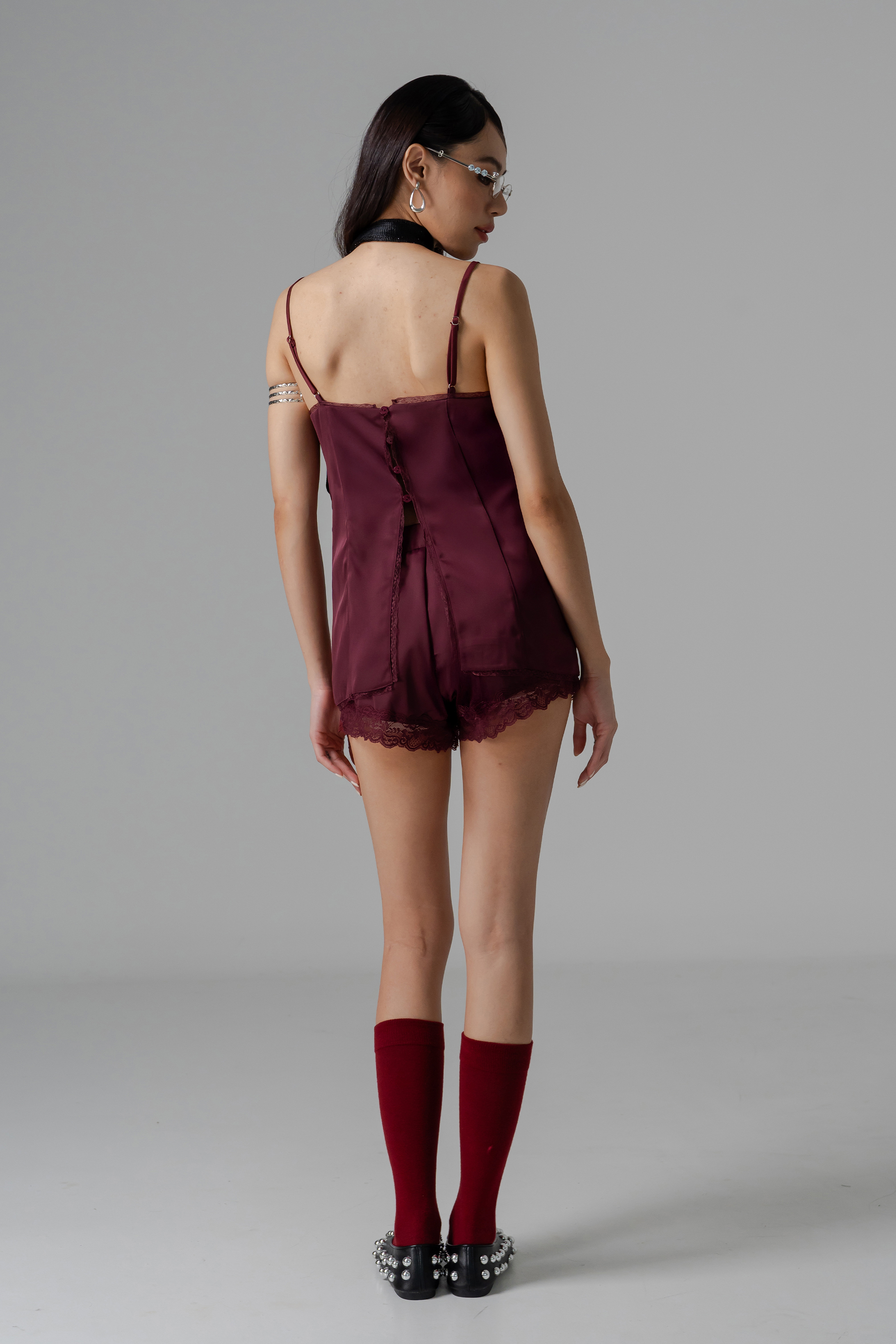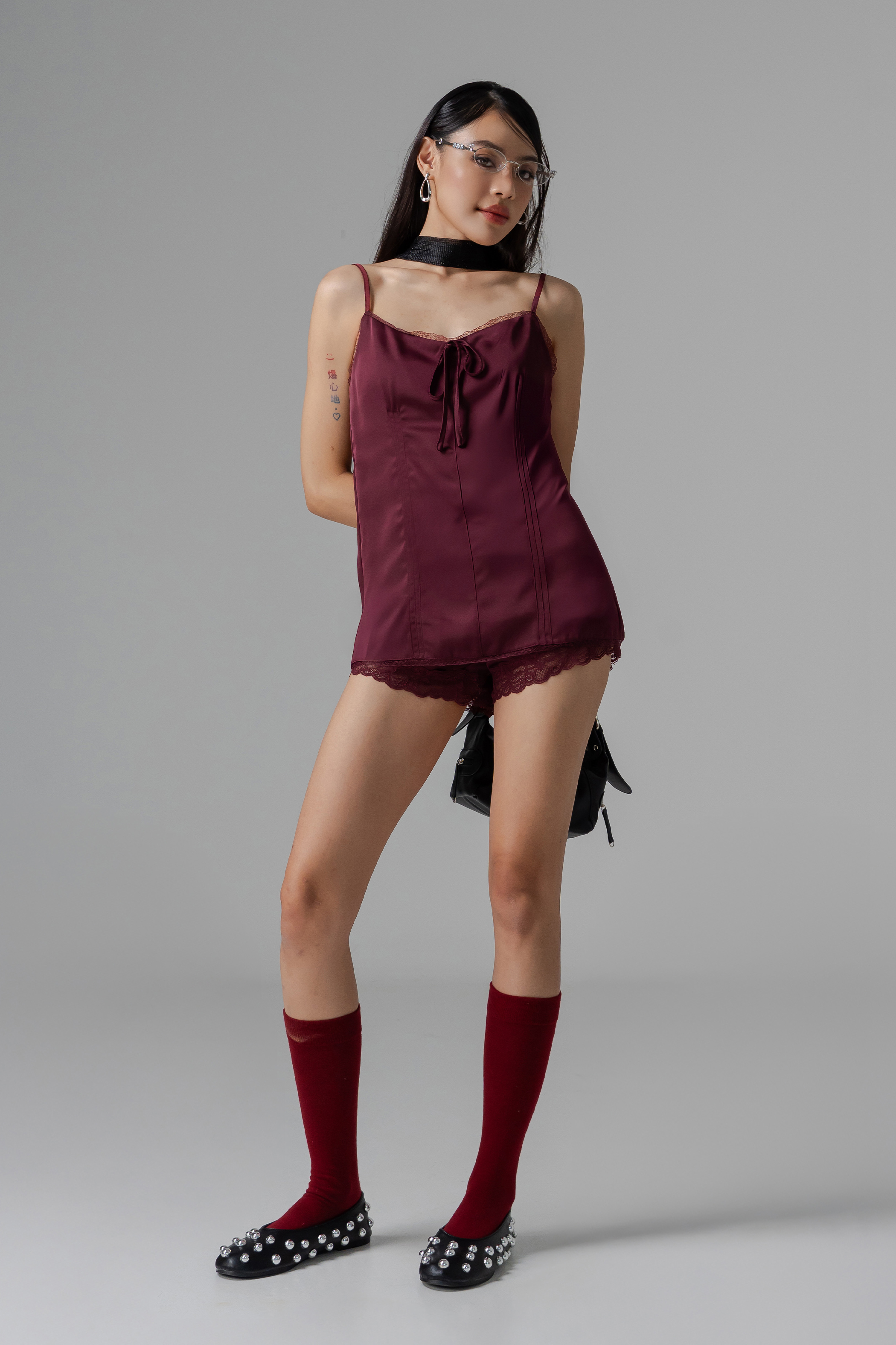 The Hush Ribbon Lace Top blends soft satin with delicate lace, featuring a sleeveless cut and a subtle front ribbon. Light padding shapes the silhouette while flowing lines give it an airy, festive glow. A feminine, edgy co-ord essential for elevated lounge or standout styling.