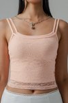 Delicate yet effortless, the Ivy Lace Double Layer Top pairs a soft, fitted base with a sheer lace overlay for subtle dimension. Thin straps and a gently contoured fit offer ease and shape, while the neckline keeps it clean and versatile. An easy layering piece or standalone essential, it balances everyday ease with quiet elegance.