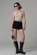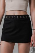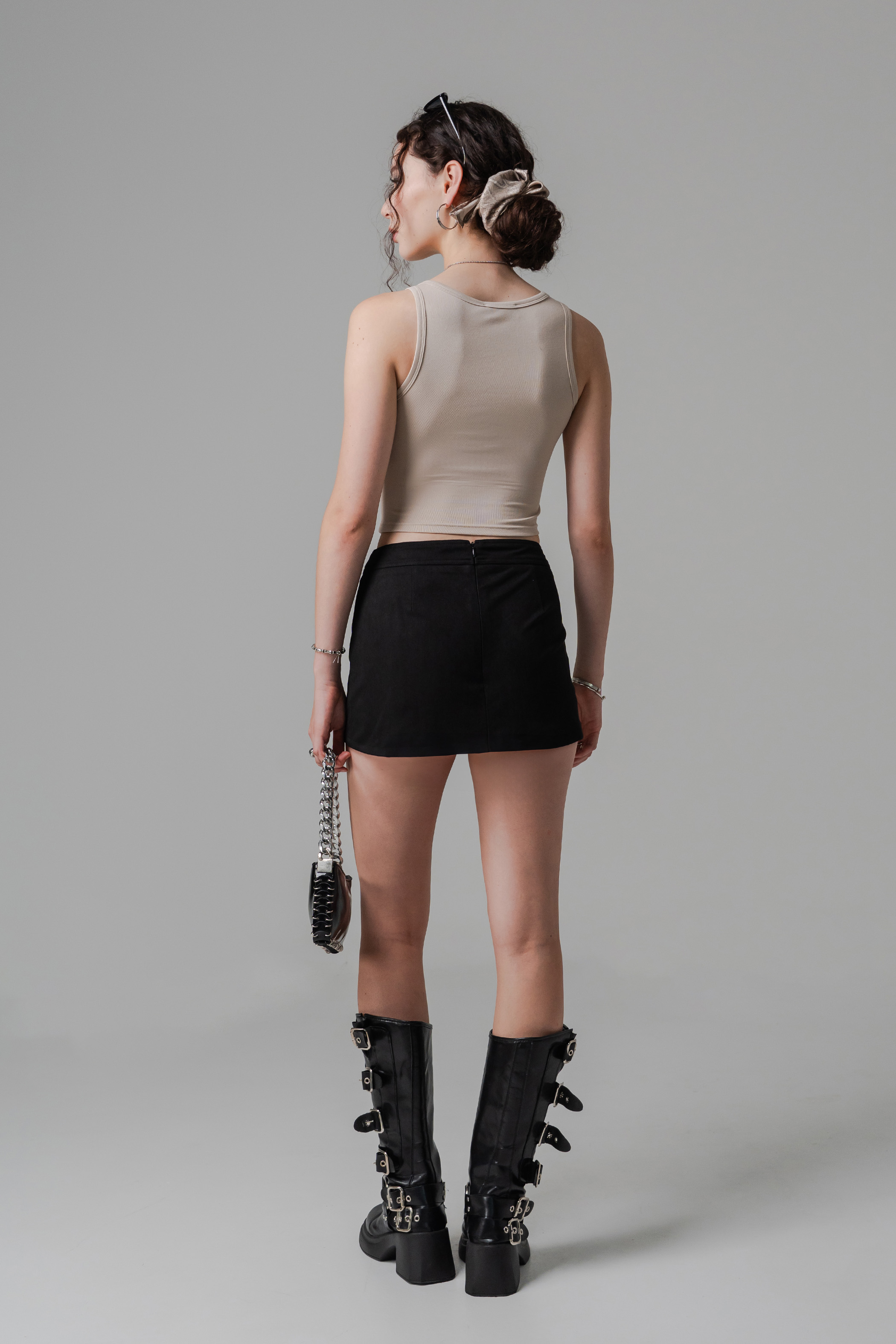 The Key Hold Eyelet Suede Skirt brings attitude in every stitch. Cut in a fitted mini silhouette, it hugs just right while showing off a bold eyelet waistline that ties back to the matching Loop Hole Eyelet Suede Halter Top. The suede finish adds that rugged, worn-in texture — soft to the touch but tough in energy. Worn together, the set hits that sweet spot between street grit and effortless cool.