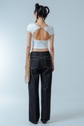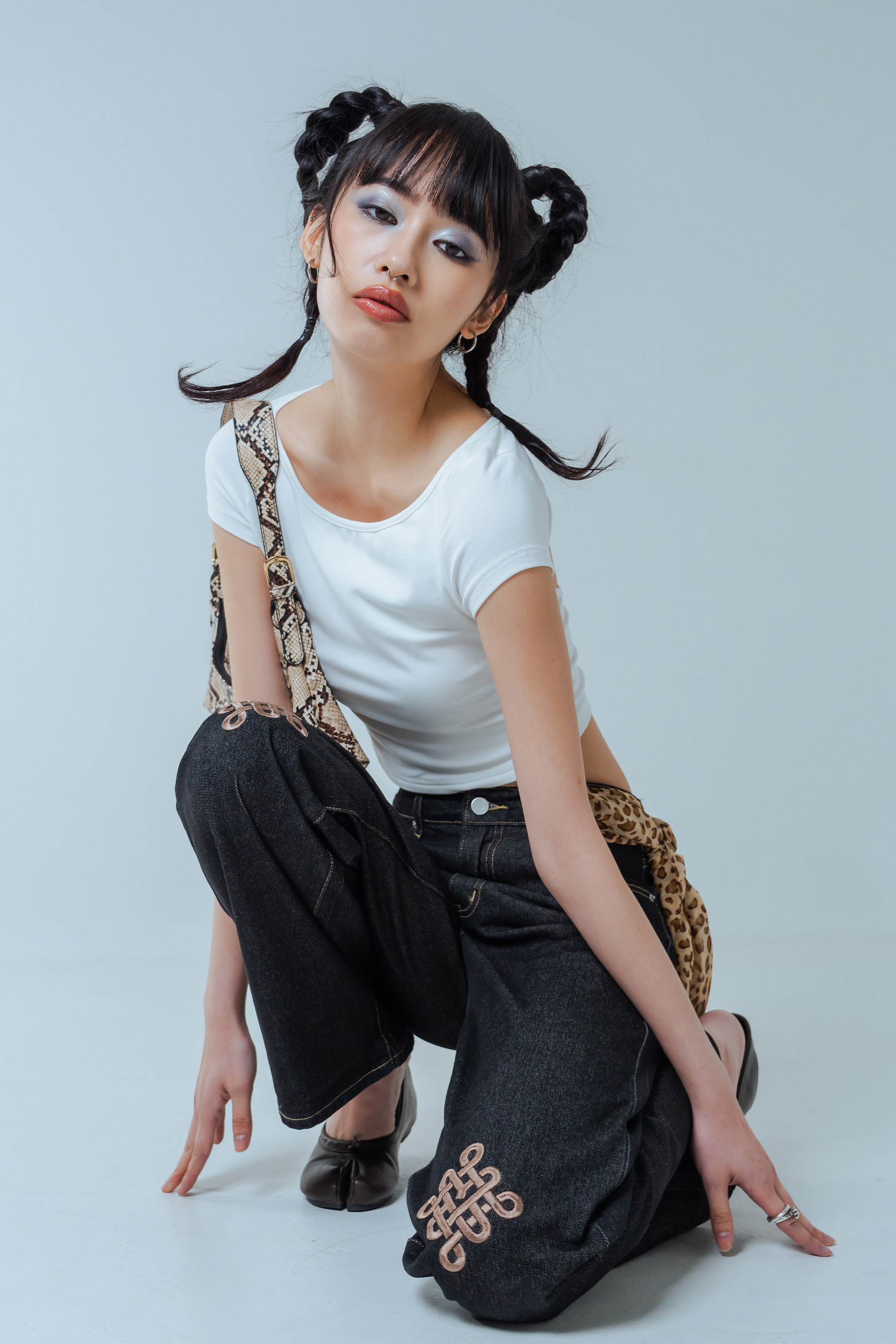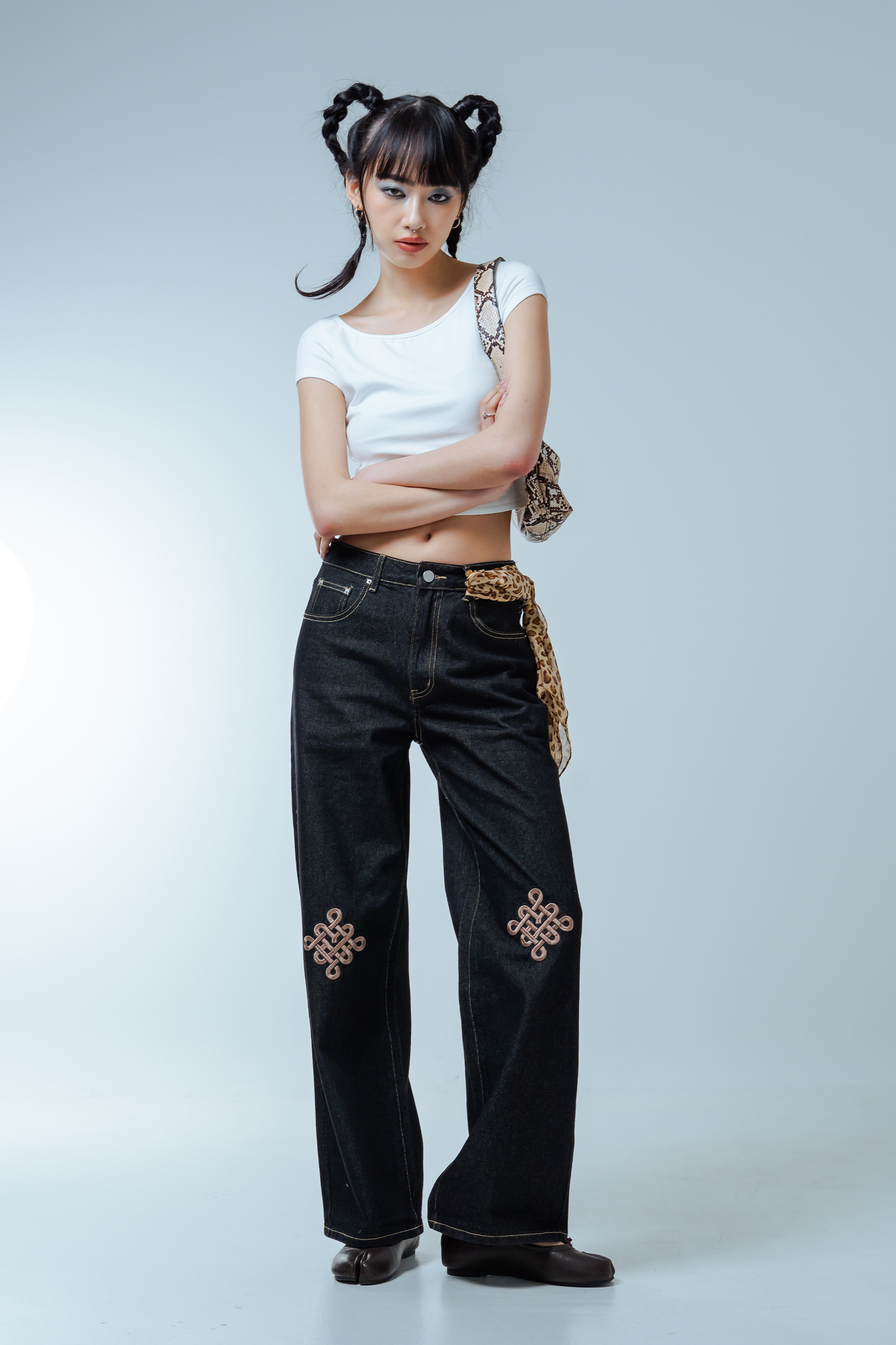 A pair that carries the charm of the collection right in its details. The straight-cut, wide-leg design keeps things grounded, while the festive knee stitching adds a surprising twist — like a lucky symbol tucked into your everyday wardrobe. Easy to style, impossible to forget.