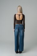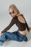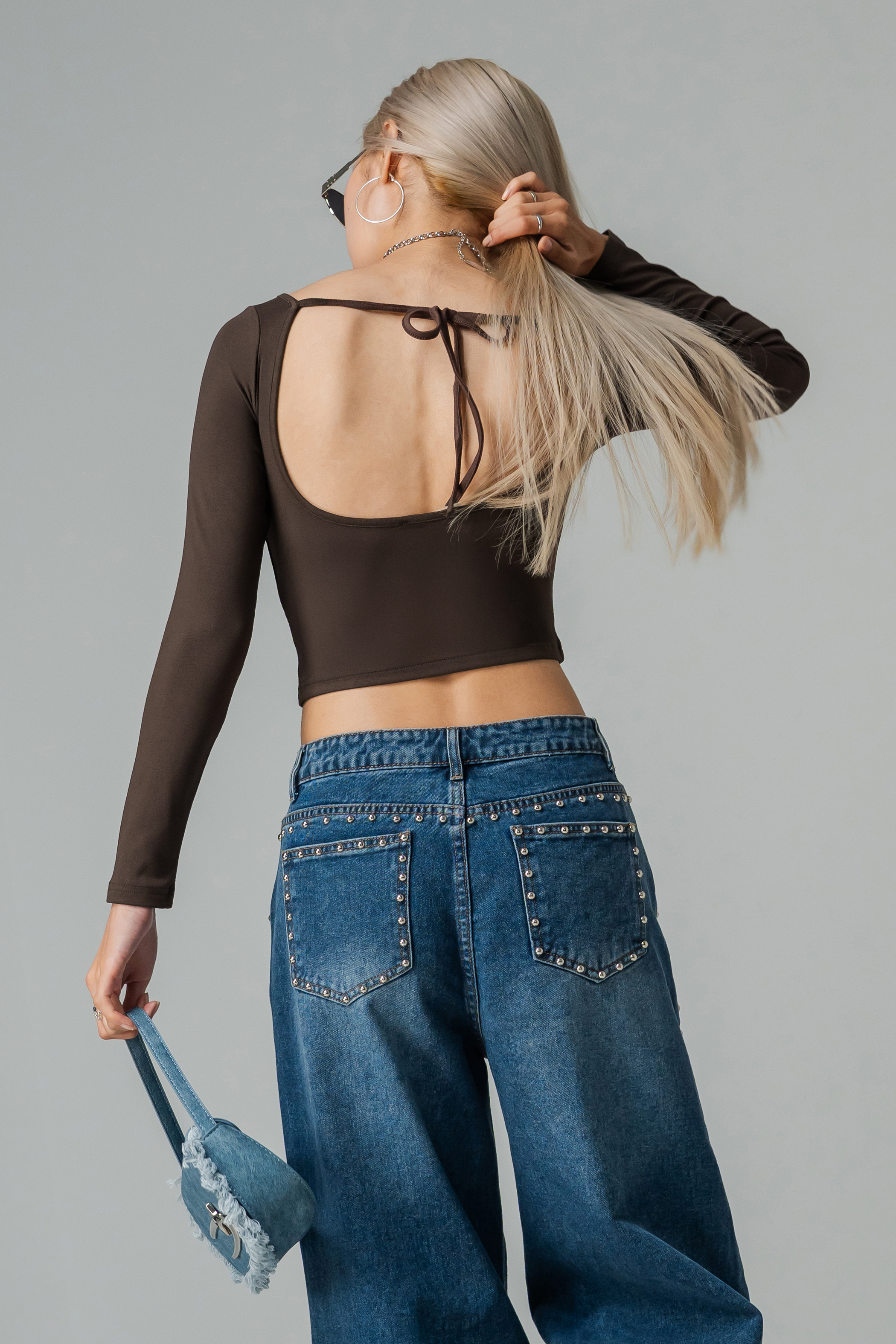 The Lumbar Tie Back Sleeve Top pairs a sleek boat neck with a cropped, fitted cut — classic in front, boldly backless with a tie detail at the back. Padded for comfort and styled with edge, it’s an easy pick for days you want something simple yet striking.