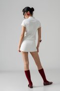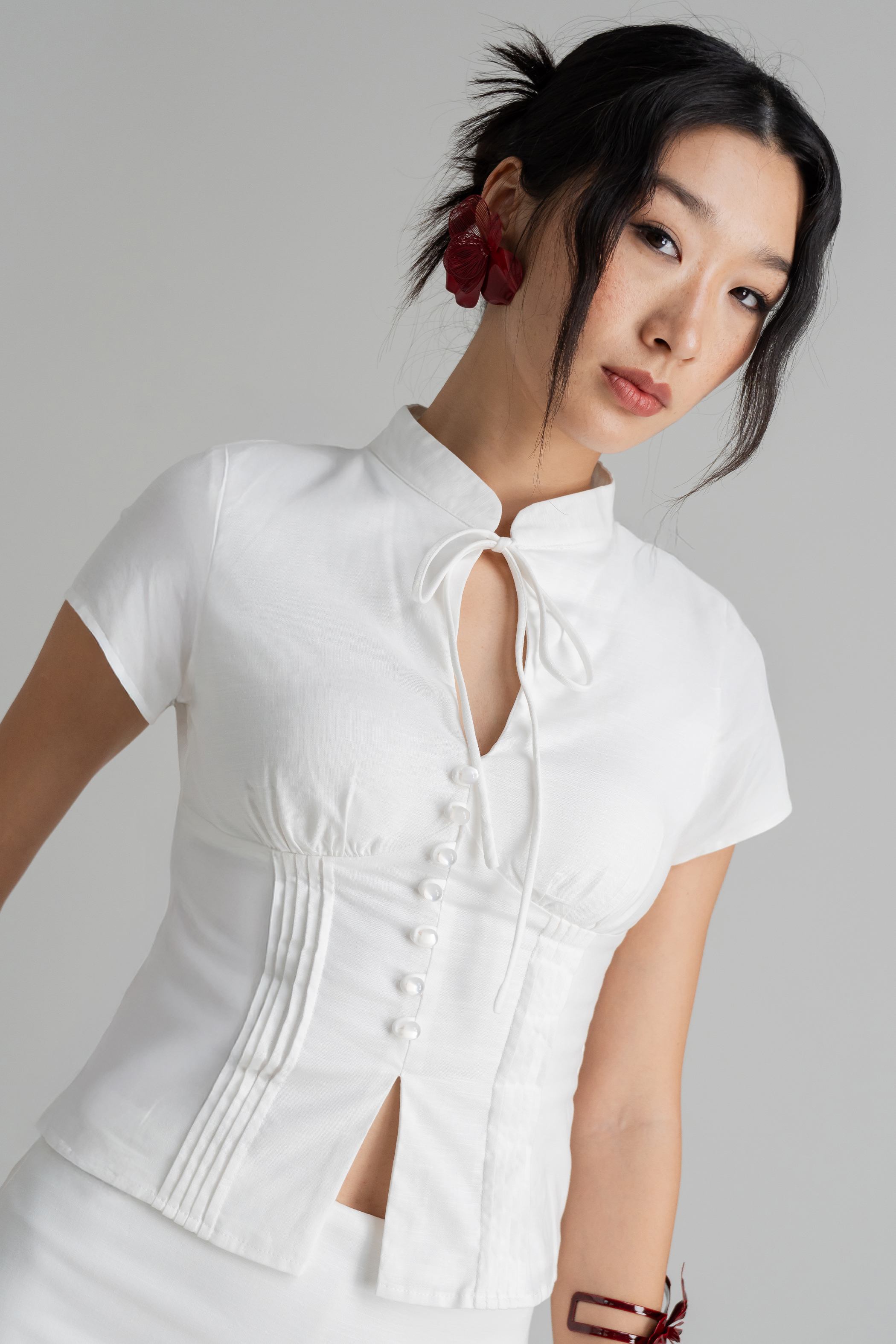 Thoughtfully tailored with a collared neckline and gentle pleats, the Paraph Pleated Linen Top brings structure with a breezy touch. Front buttons and a fitted, padded finish refine the look, especially when worn with the Perceive Linen Skirt. A versatile festive basic that slips effortlessly between lounge and polished styling.