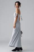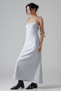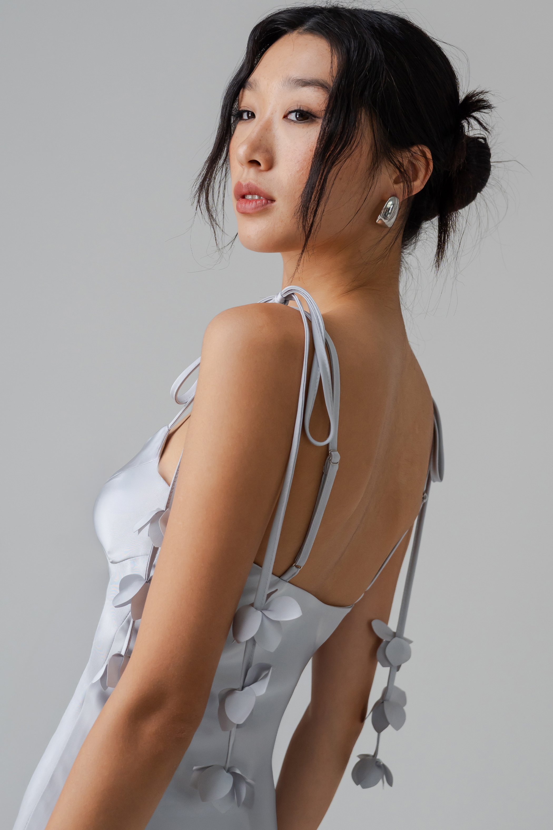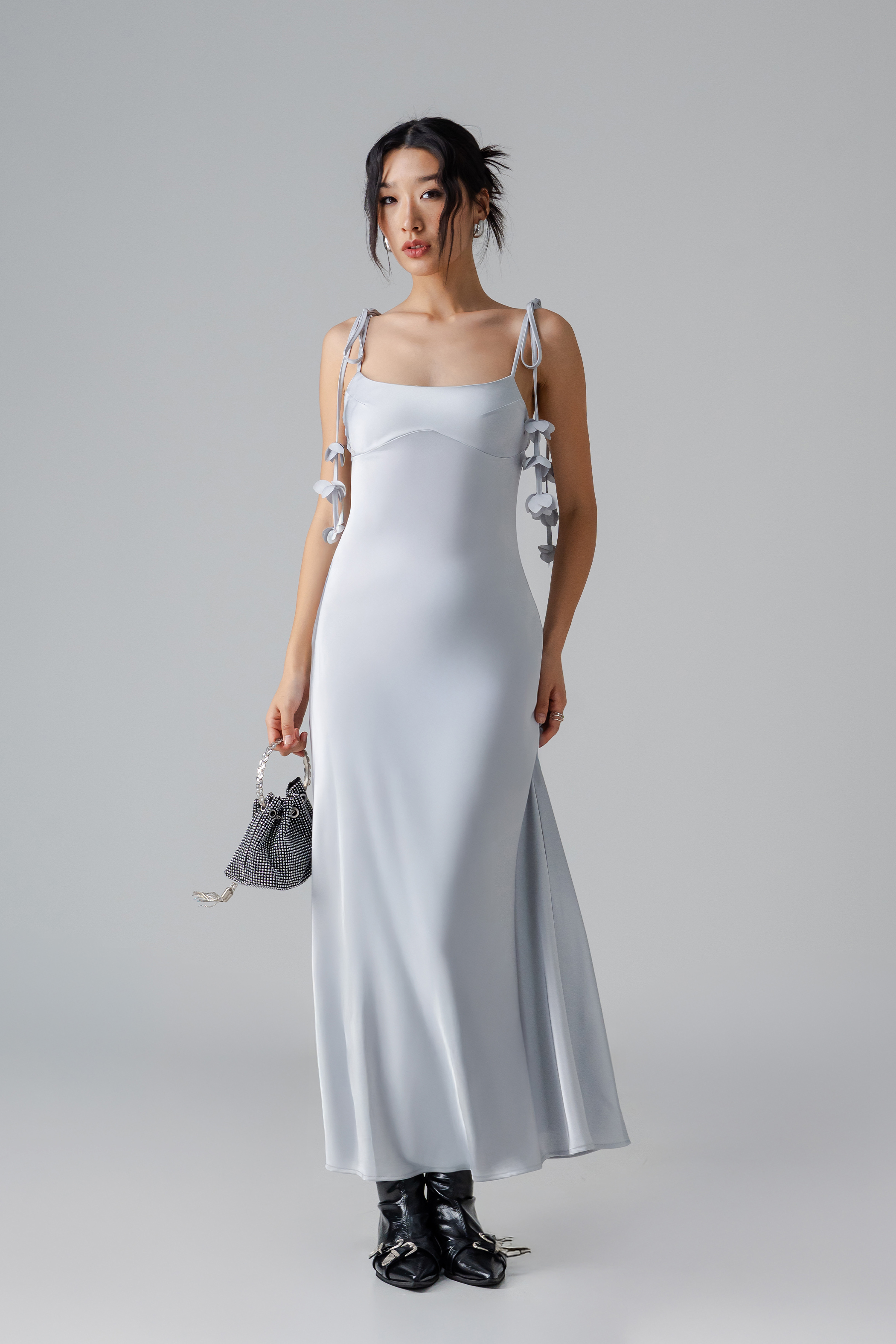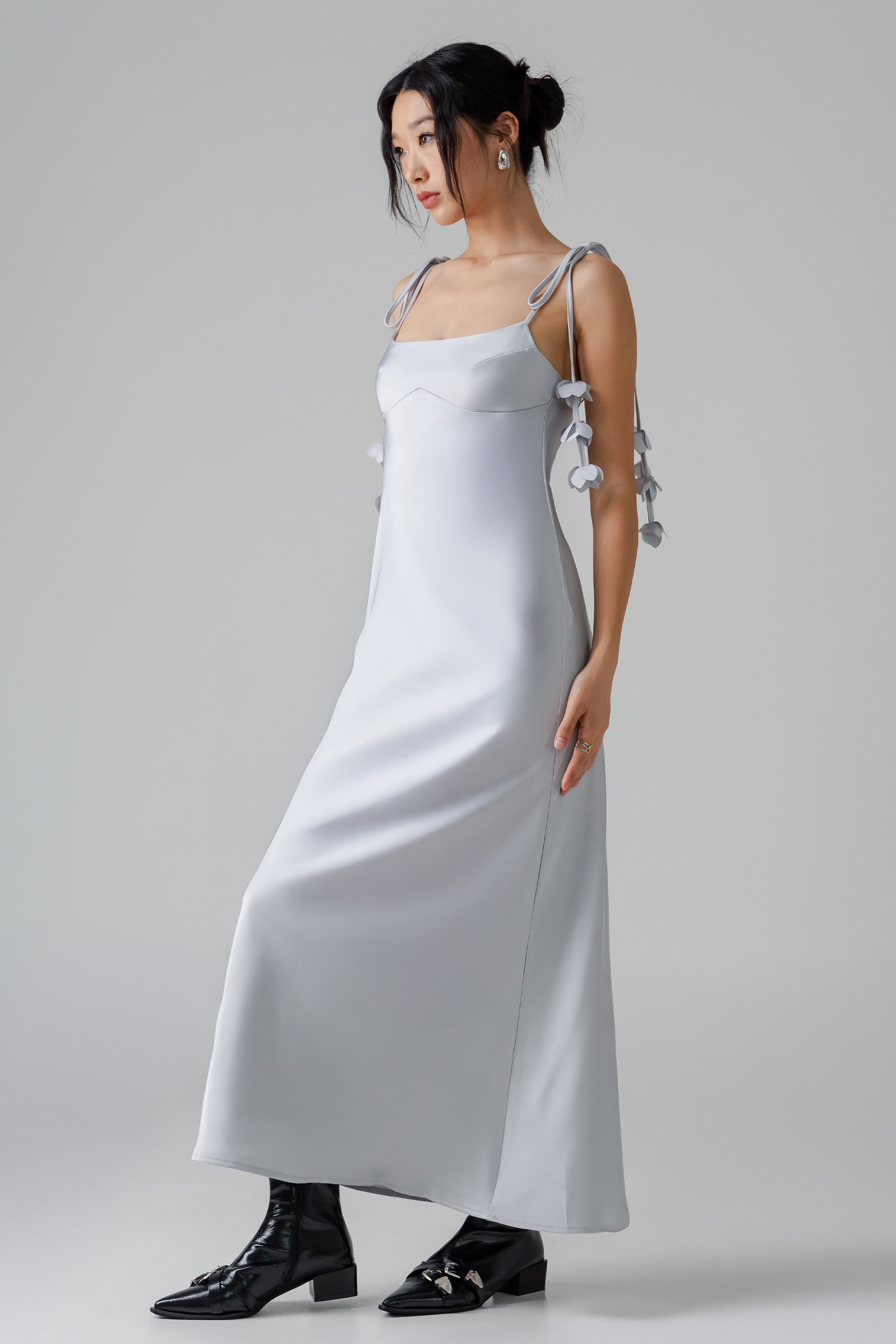 Soft satin glides effortlessly in the Petal Satin Maxi Dress, with petal straps that float with every step. Its flowy shape feels both dreamy and luminous, a standout for festive gatherings with a touch of bold elegance. A piece made to turn moments into memories.