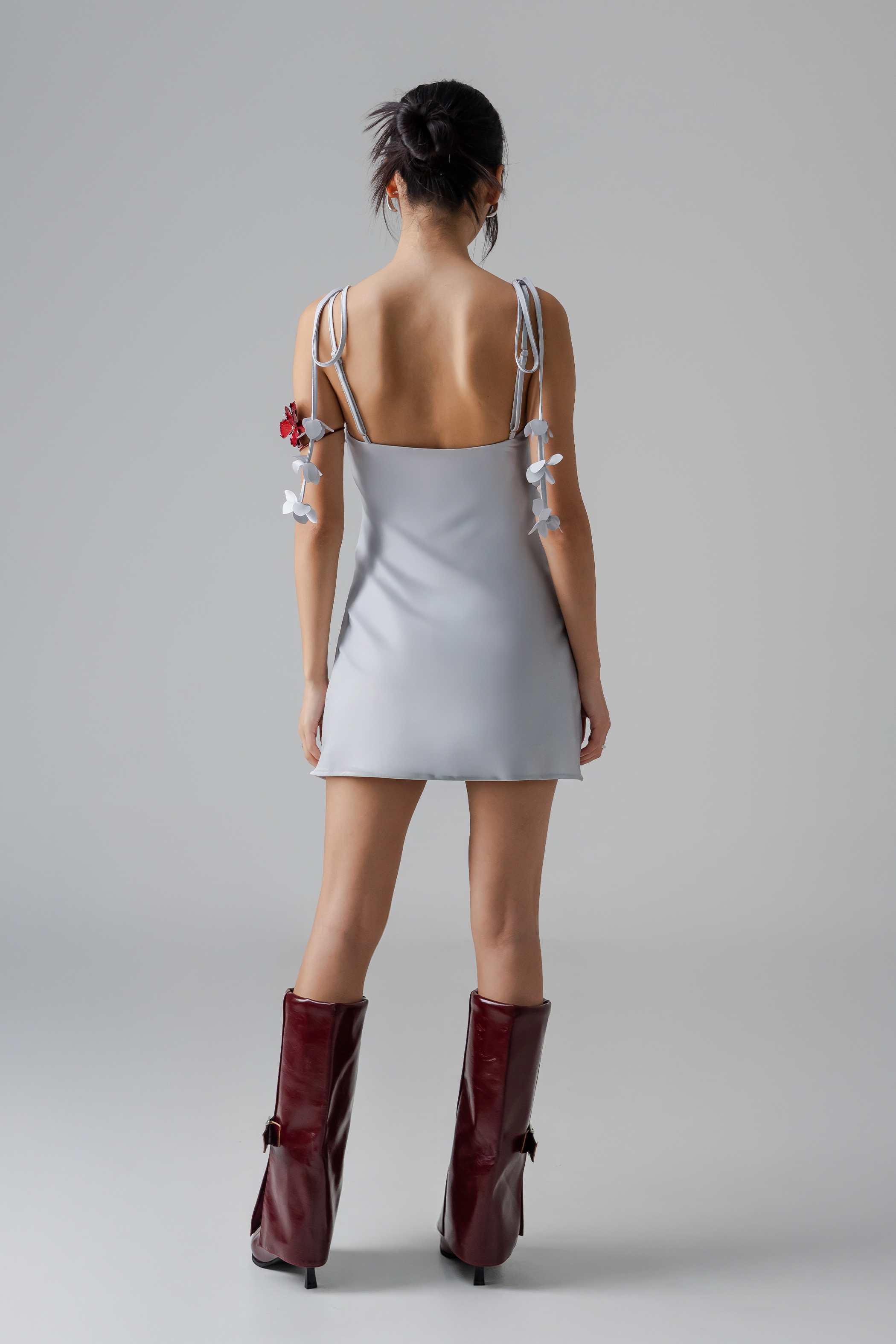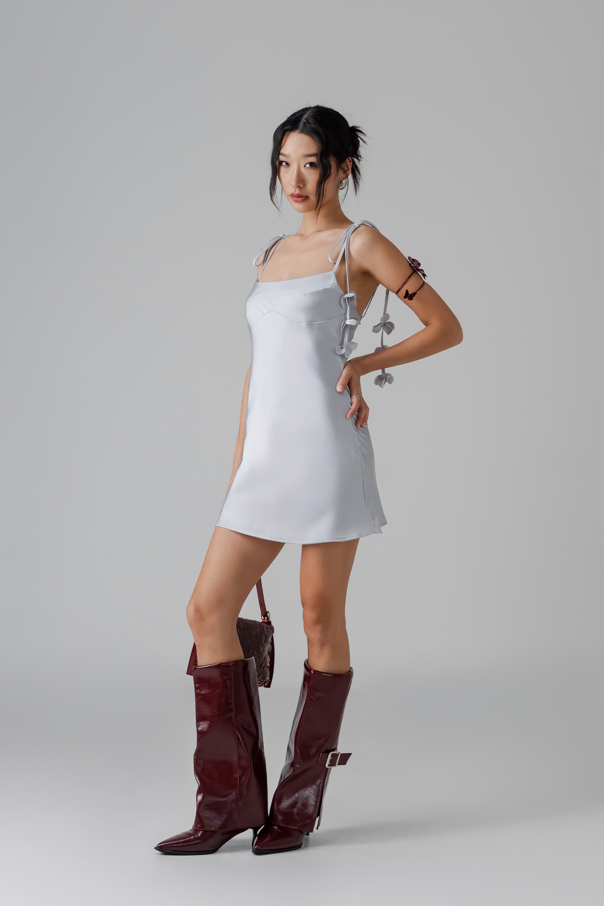 The Petal Satin Mini Dress captures the same satin romance in a flirty, playful length. Petal straps add a whimsical, ethereal note, while the flowing silhouette keeps it lively and festive. Perfect for cozy celebrations or striking day-to-night looks.