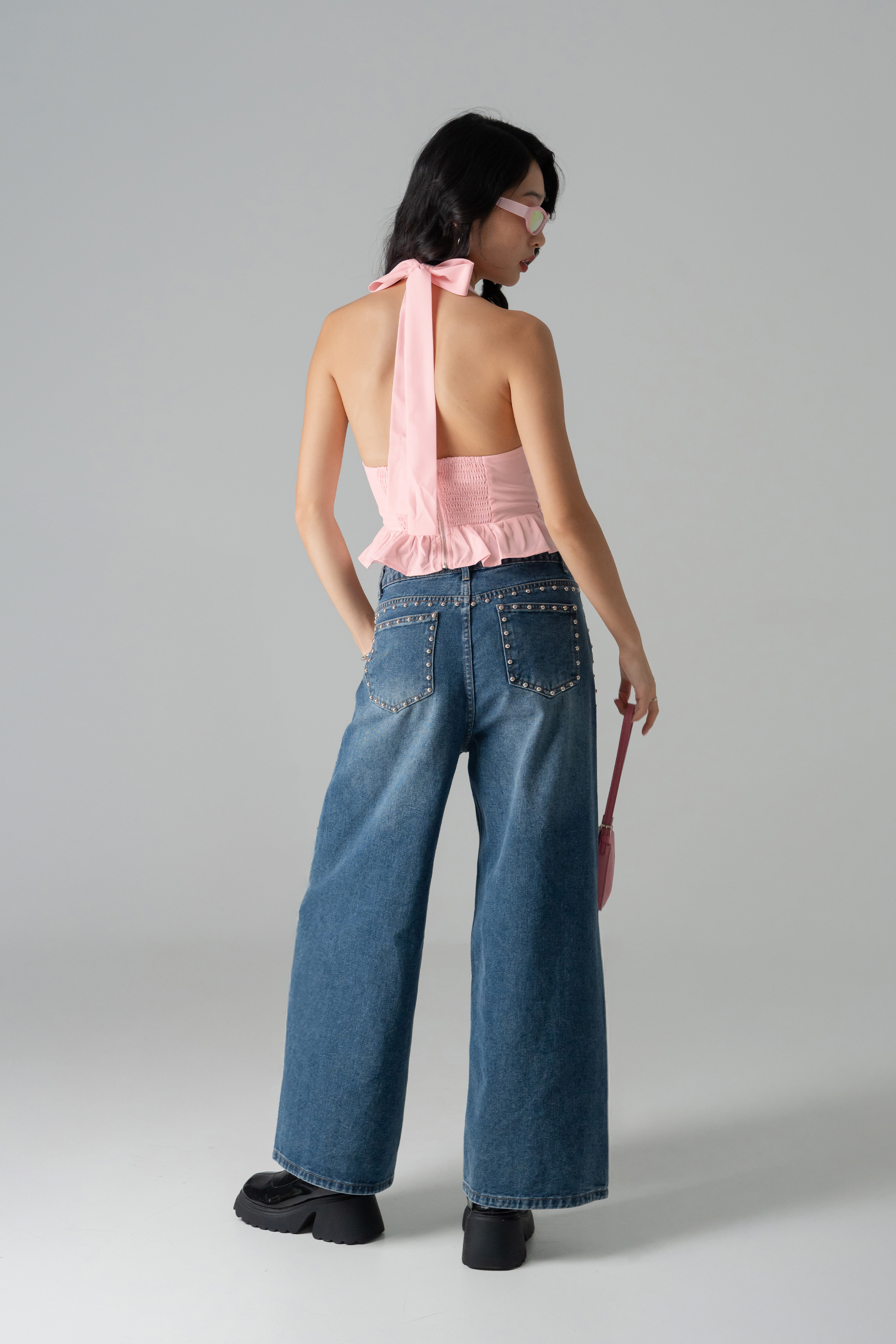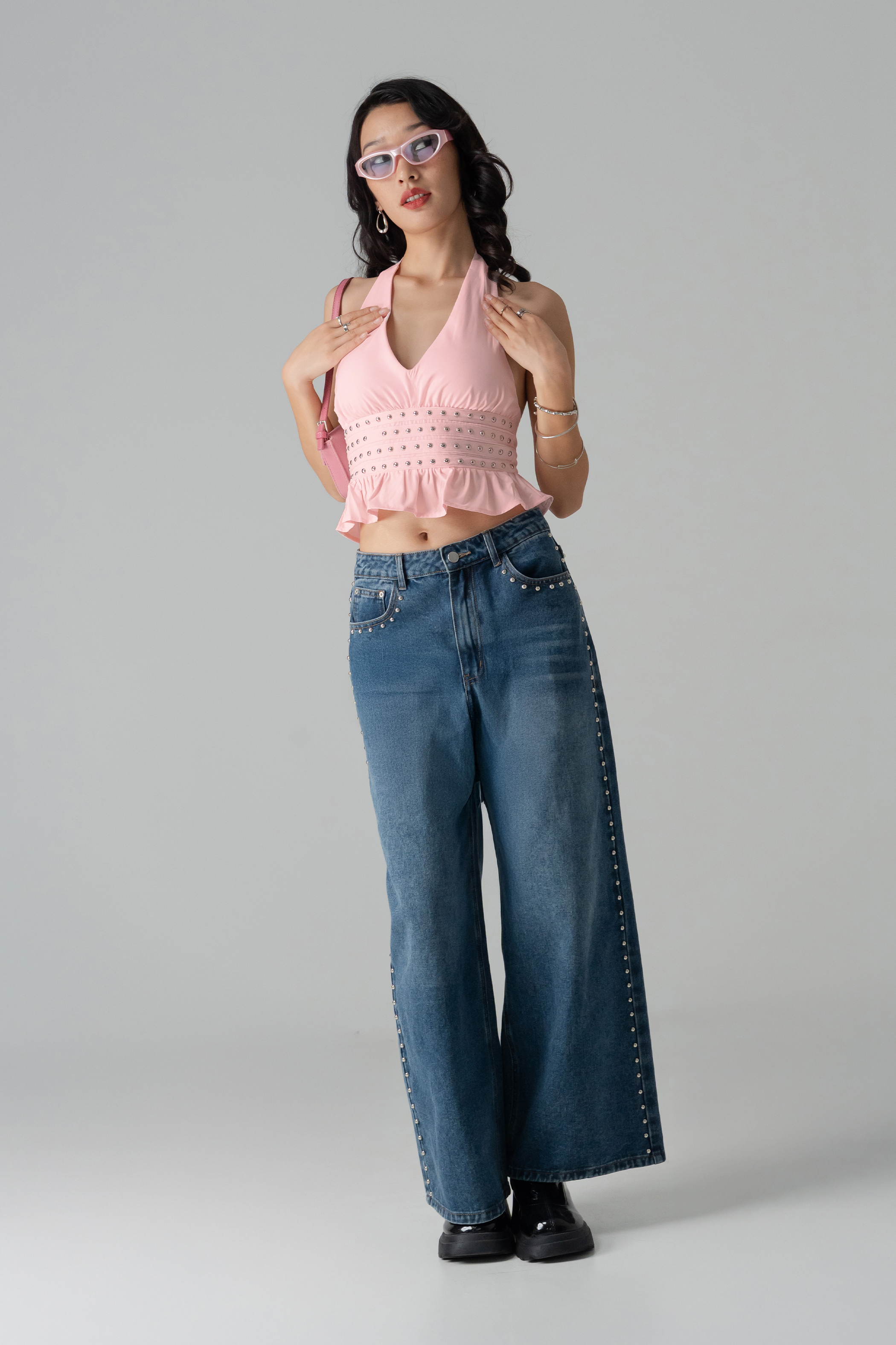 Radiant and edgy, the Pixel Studded Halter Top features a V-neck, backless silhouette, and a studded center that catches the light like stardust. Smocked back and ruffle ends offer fluid movement, while built-in padding keeps you confident. Perfect for nights where you want to steal the galaxy’s spotlight.
