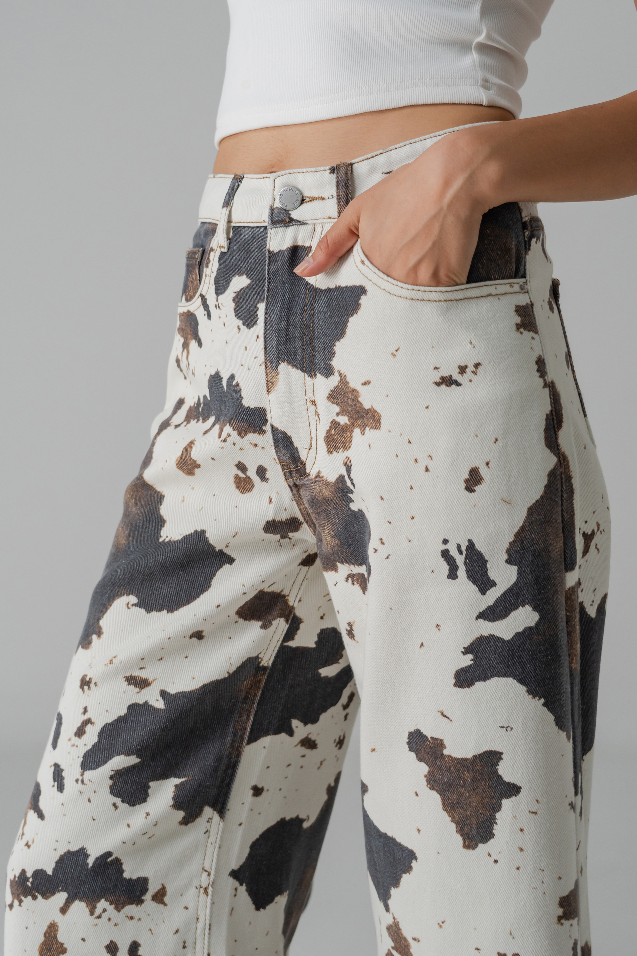 The Prolonged Straight Cut Jeans elevate your wardrobe with their flowing wide-leg silhouette and relaxed, straight-cut fit. This essential pair combines effortless comfort with a flattering, fashion-forward shape. Now available in fun new patterns — Cow Print and Pink Leopard — for a playful twist on this classic silhouette, adding a bold, statement-making touch to your wardrobe.
