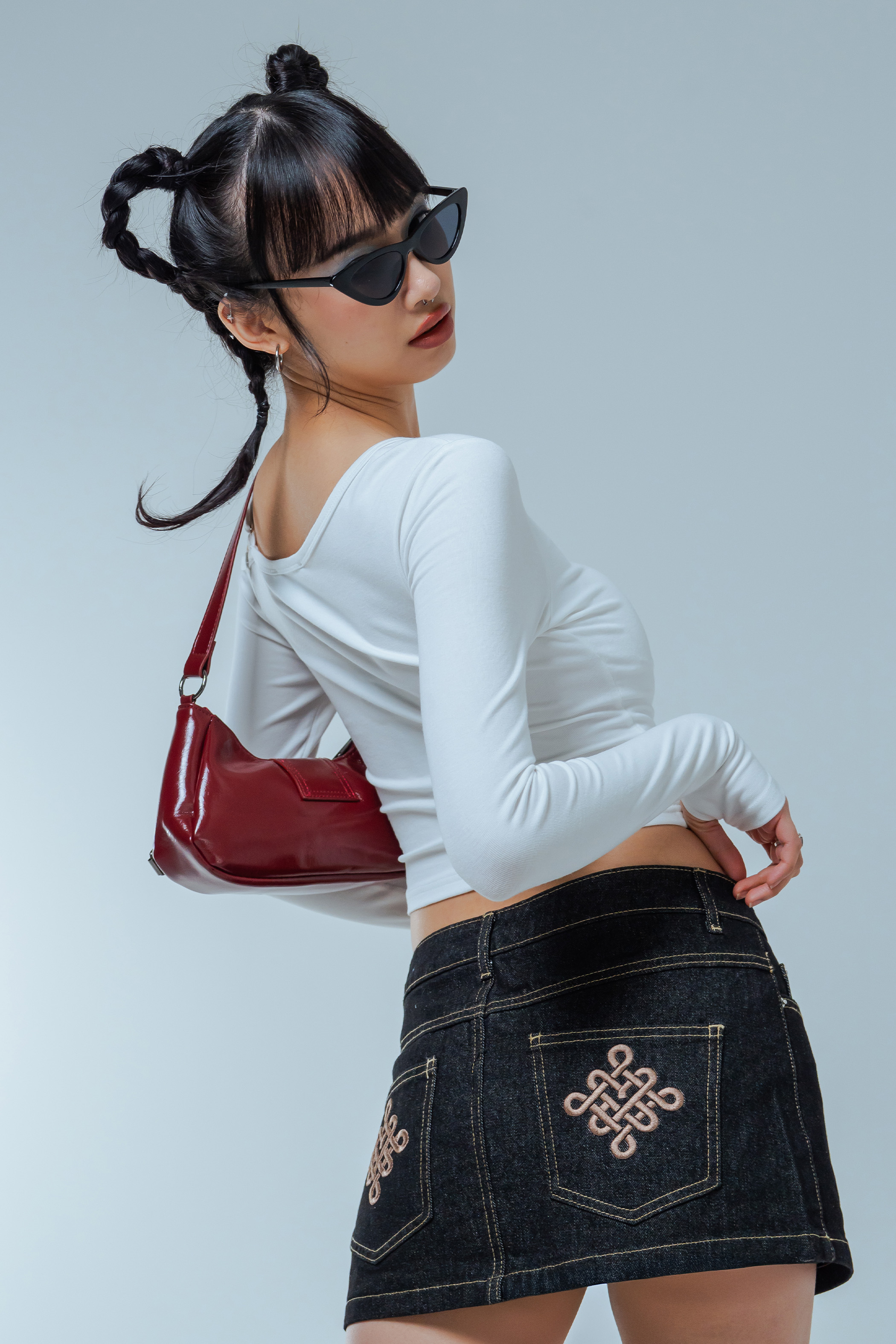 A mini made for festive moments — denim with attitude, finished with intricate Prosperous stitching on the back pocket. Its clean lines and playful length bring a youthful spark, while the crafted details add a celebratory touch. A skirt that feels both grounded and ready to shine.