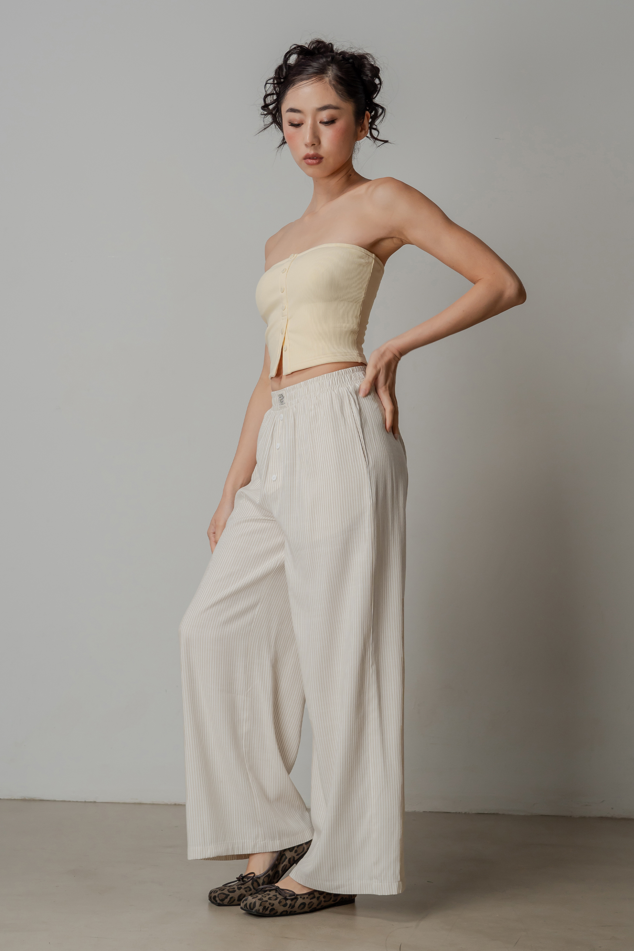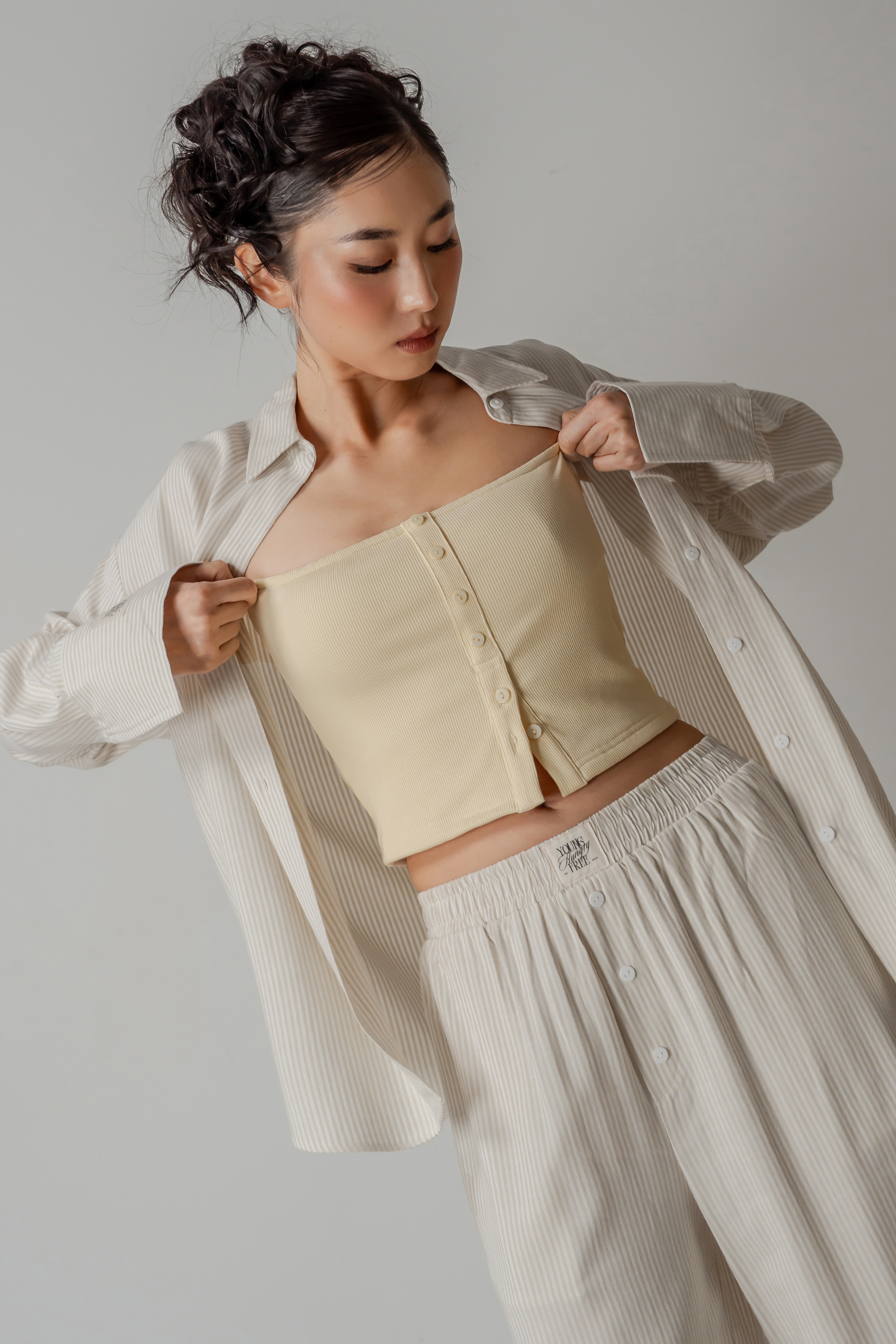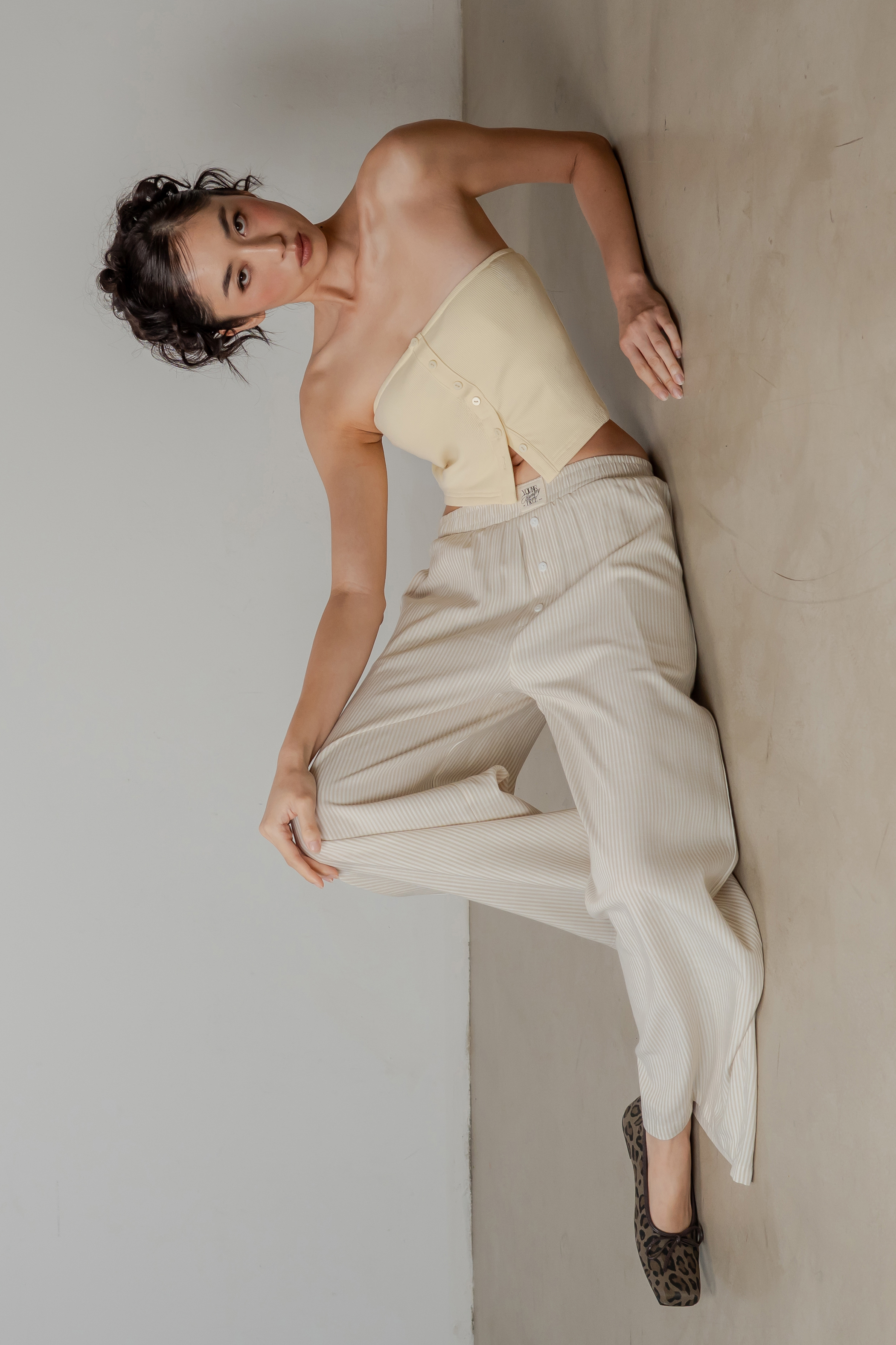 The R&R Relaxed Lounge Button Pants are back with refreshed stripe colours. Designed in a flowy maxi cut with a gentle flare, they pair refined button details with a soft rubber waist for all-day ease. Style them with the matching tops for a simple, coordinated look suited for lounging, travel, or daily wear.