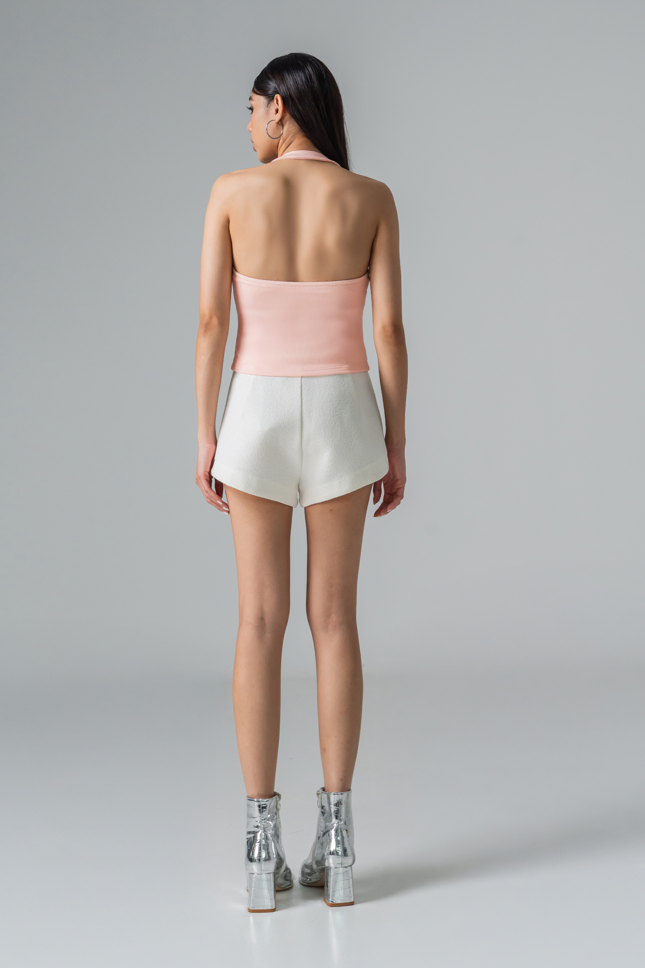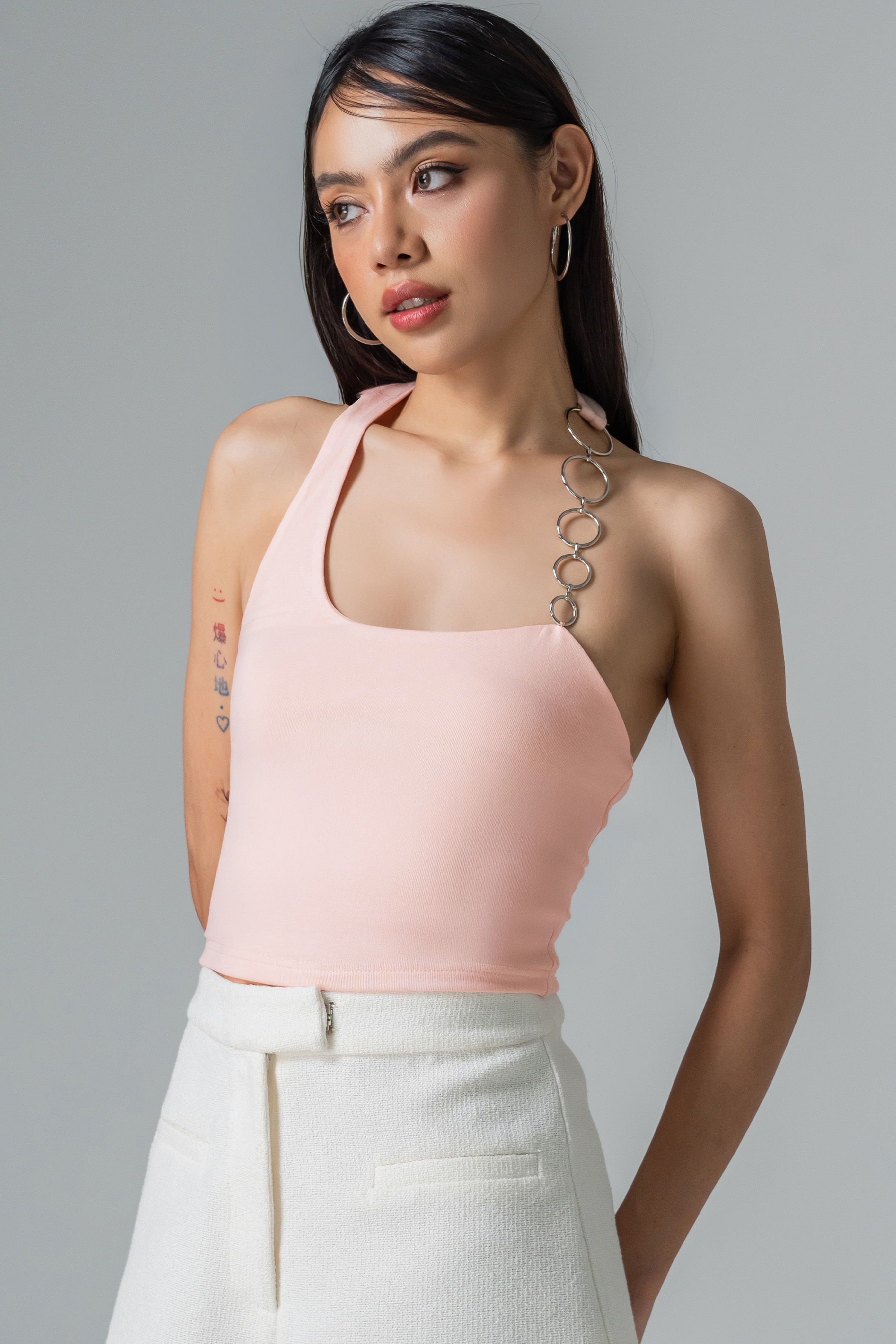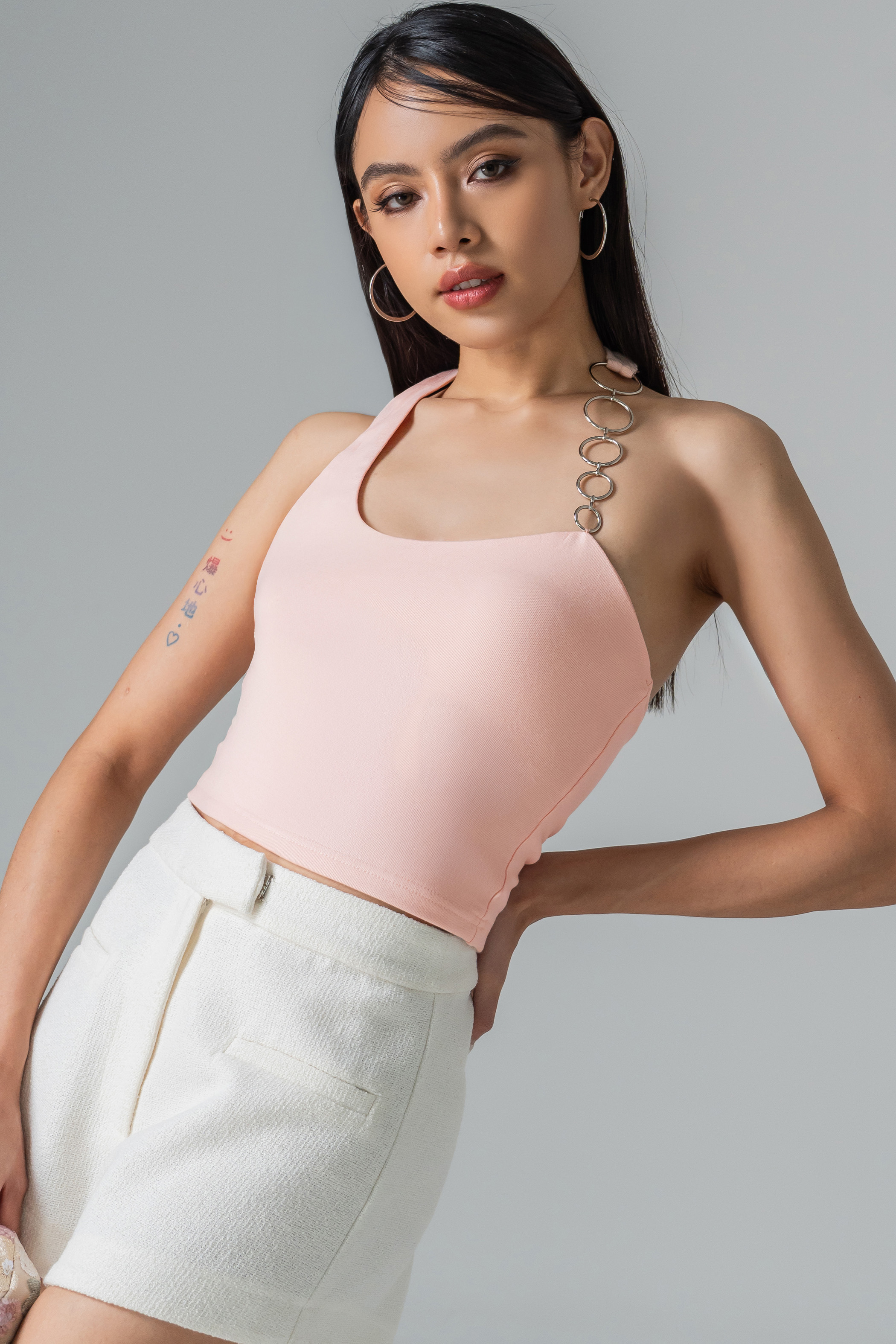 Metal-ringed halter straps hint at mischief, while the cropped fit keeps the energy playful yet polished. Padded for comfort, this top moves with you. A piece that feels alive with style, edge, and personality.
