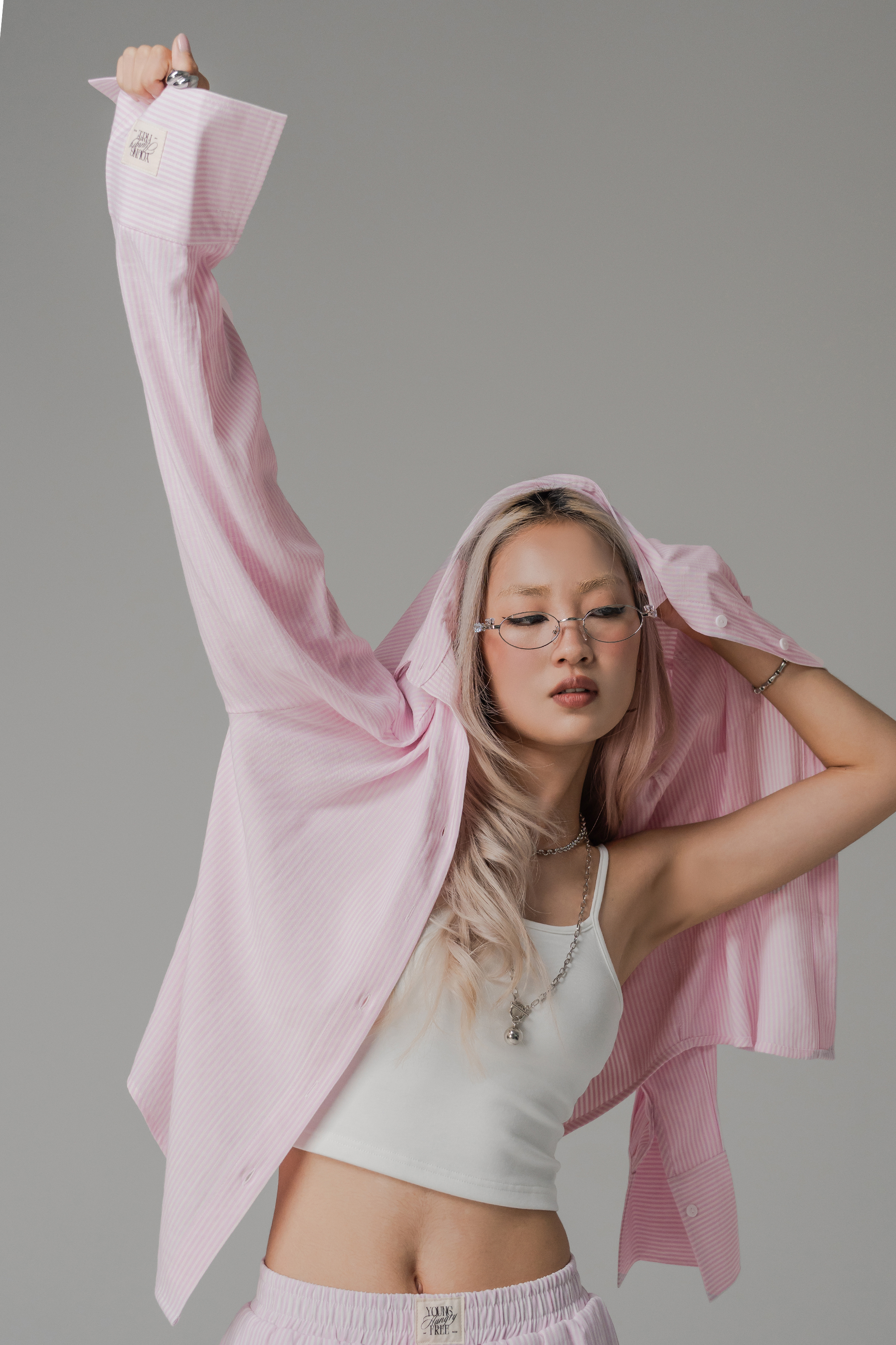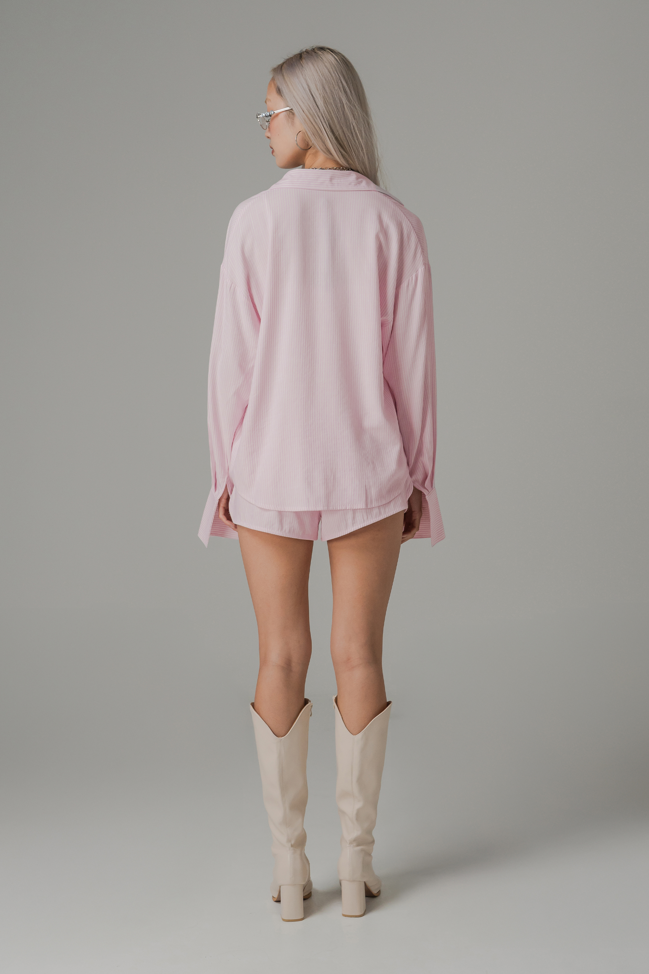 Sedate Lazy Oversized Shirt Button Top in Baby Pink Stripes