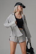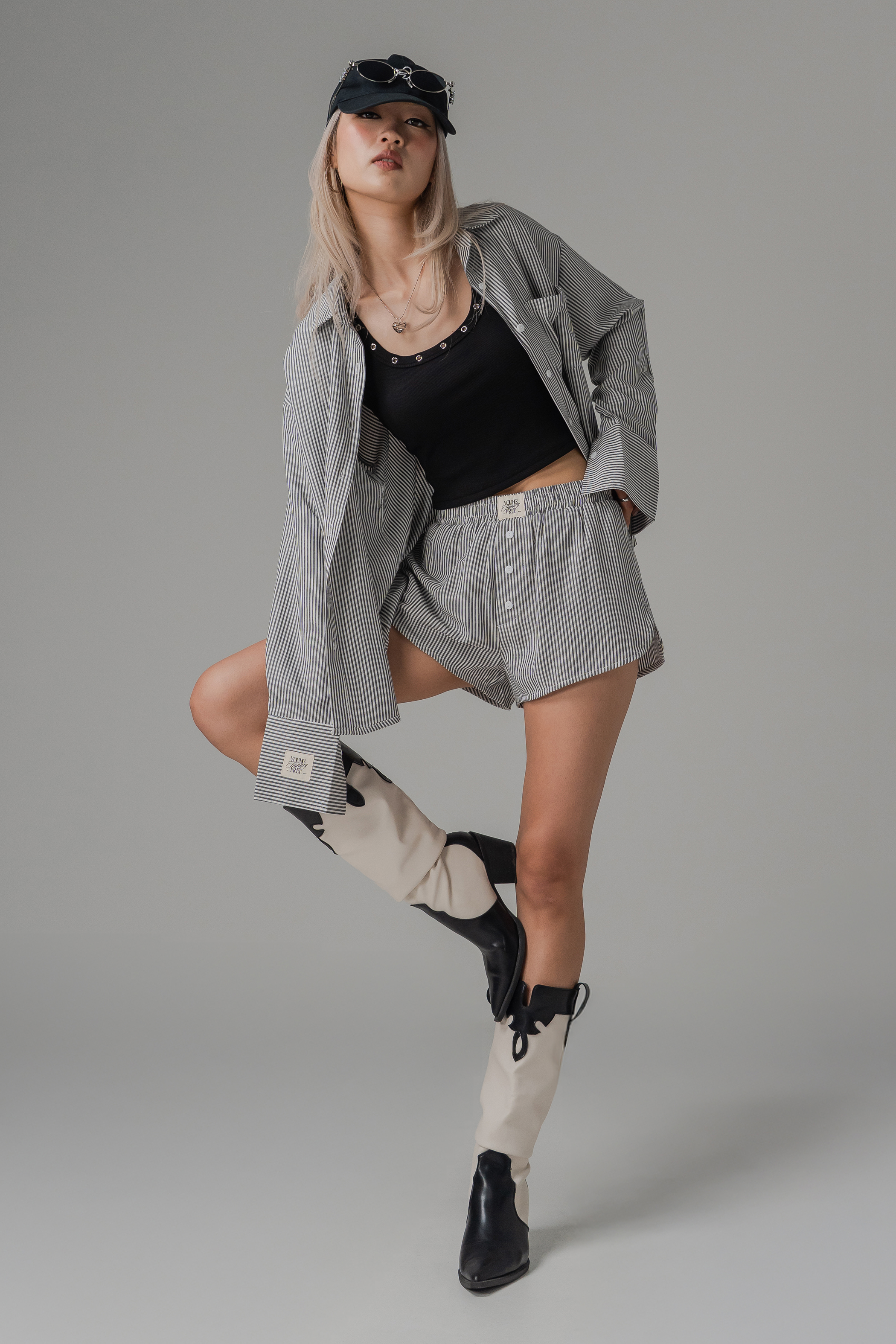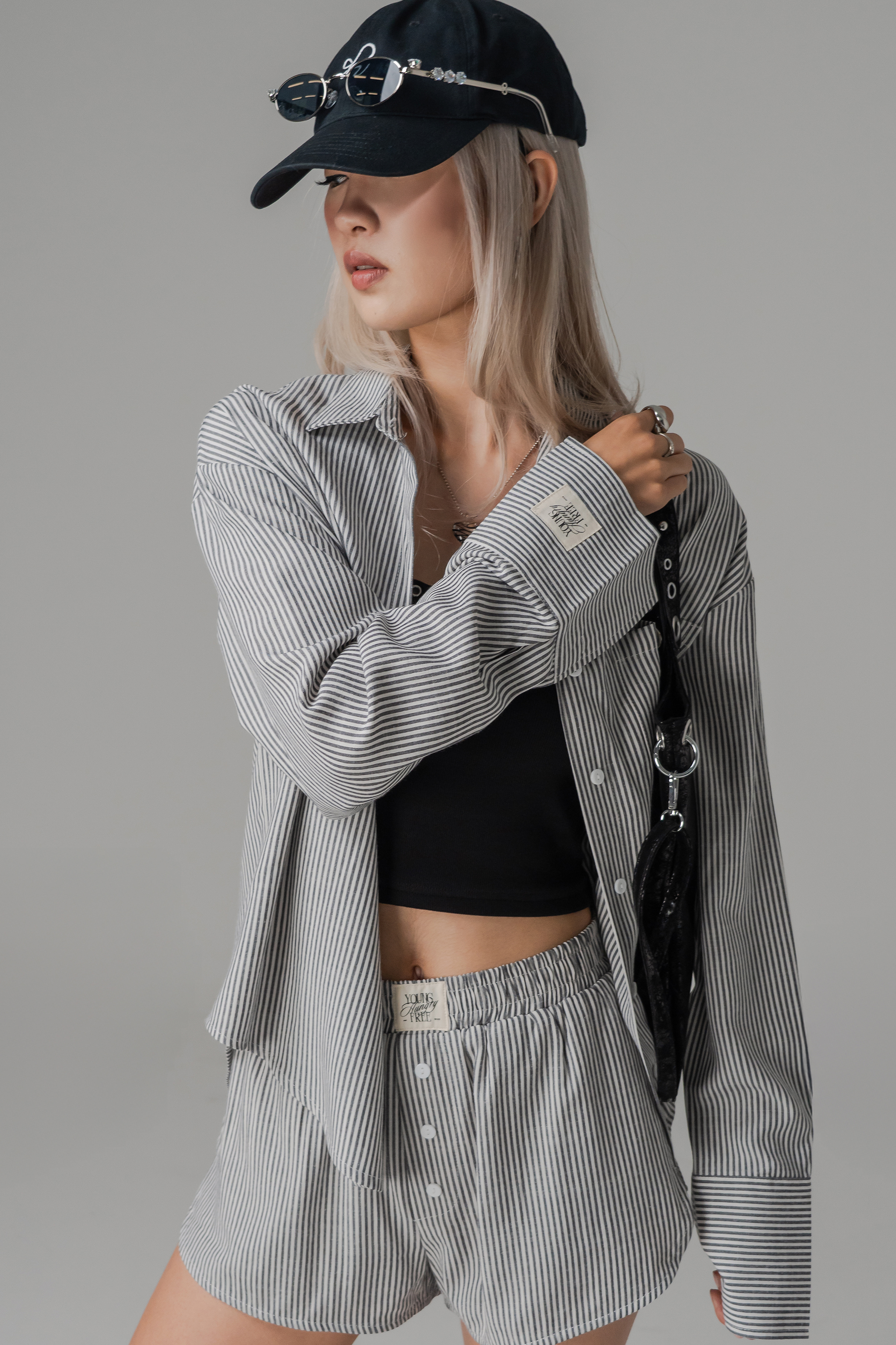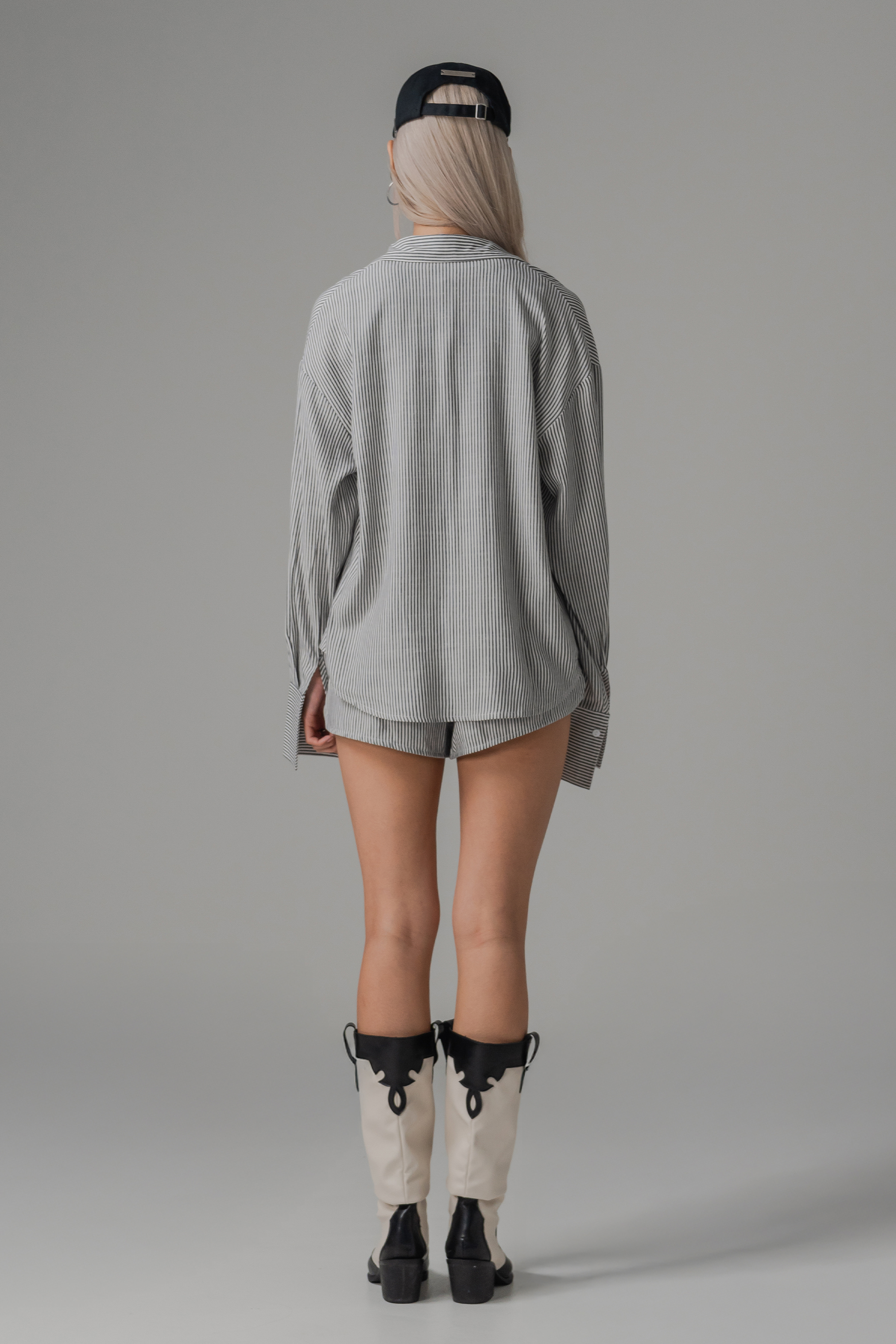 Easy and unhurried, the Sedate Lazy Oversized Shirt Button Top is cut in a loose, drapey silhouette that moves with you. Featuring clean stripes, a collared neckline, and full button-front detailing, it blends everyday comfort with a touch of polish. Style it with the coordinating pants or shorts for a laid-back yet cohesive lounge set.