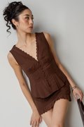 The Brunch Button Linen Top keeps things easy and feminine — crafted from soft linen with light padding for comfortable support. Designed with a sleeveless cut, front buttons, subtle pleated details, and a delicate lace hem, it’s a simple yet special essential. Pair it with the Weekender Pleated Linen Skirt for a perfectly coordinated, effortless look.