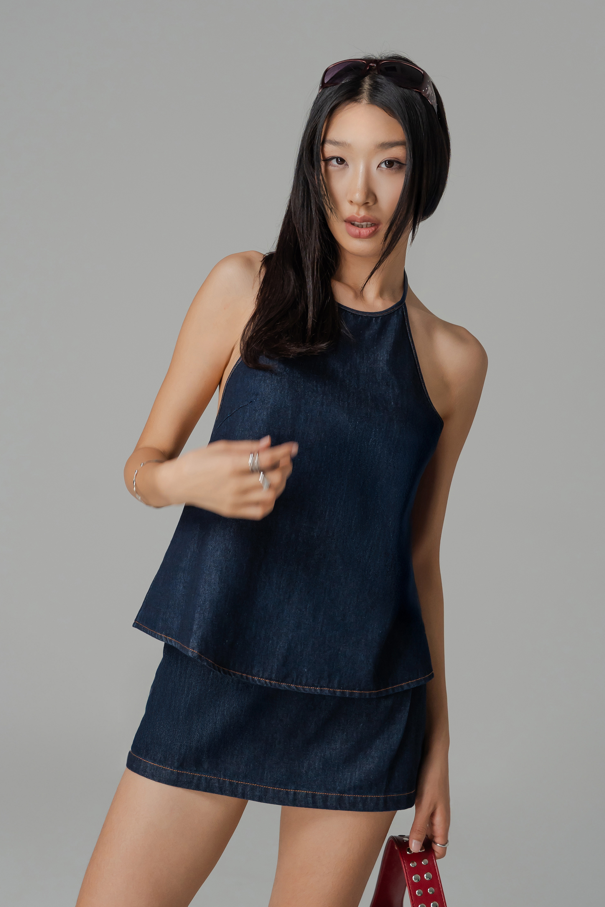 SET: Charge Denim Halter Top + Dart Denim Belted Skirt