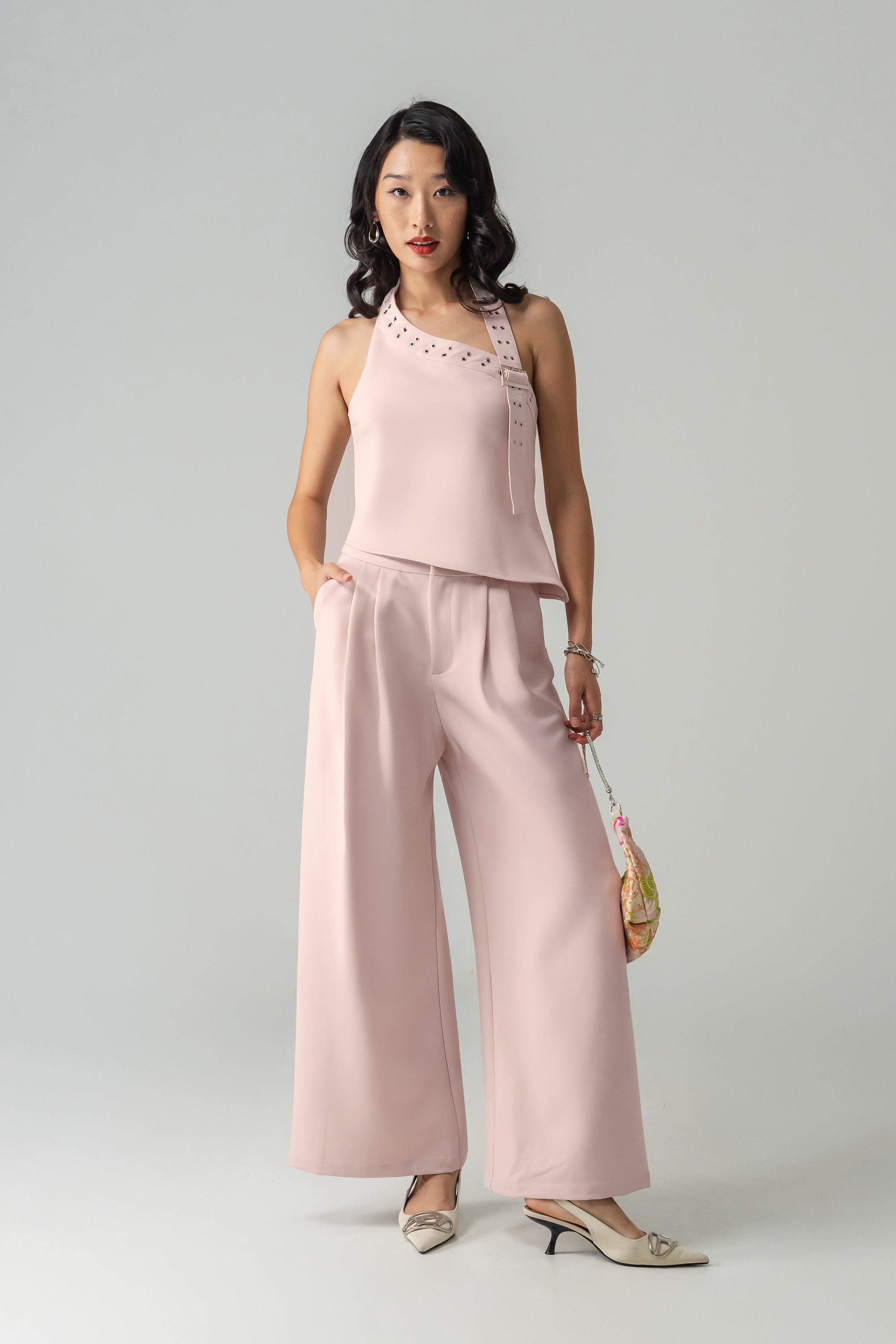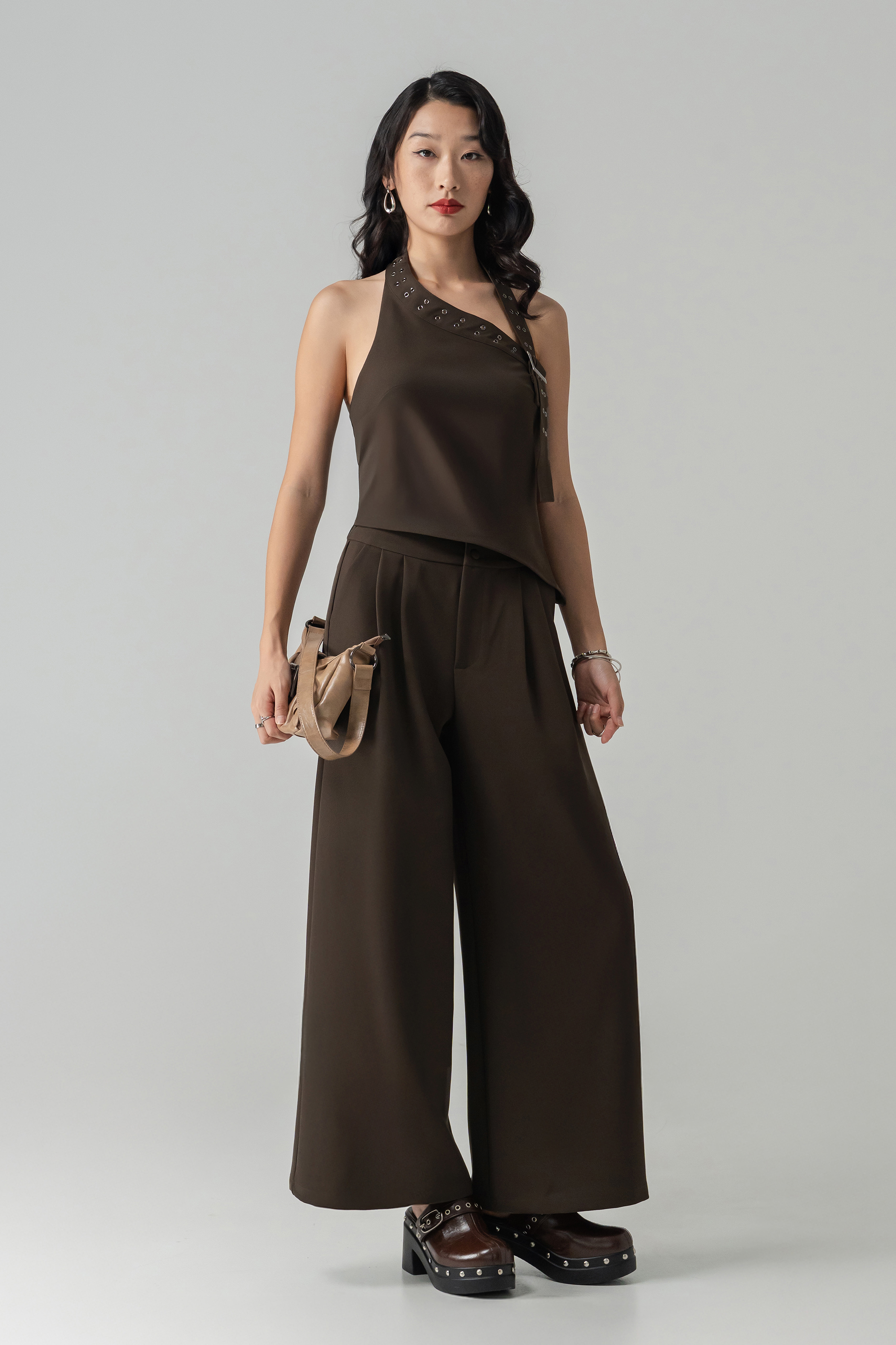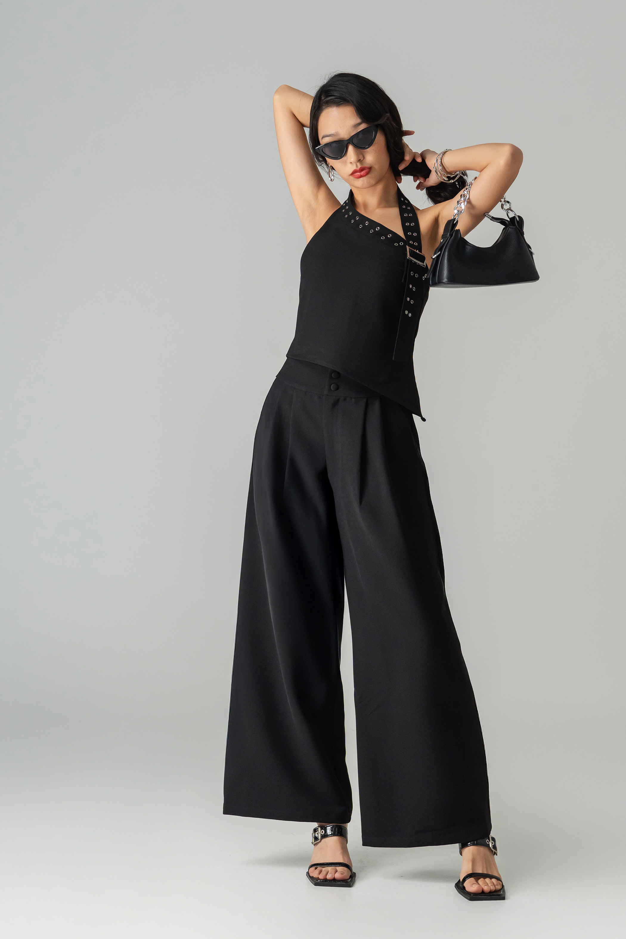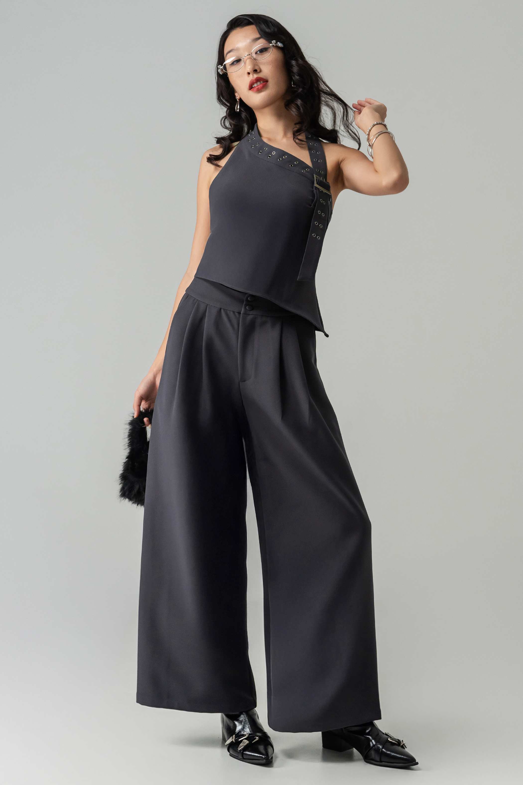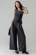 Polished with a commanding edge, the Power Button Pants are designed to elevate everyday dressing. Featuring a tailored high-waist silhouette with statement button detailing, these wide-leg trousers create a strong, elongated line while remaining fluid and comfortable. The structured front meets a relaxed drape, striking the perfect balance between power and ease—ideal for confident styling that feels effortless yet intentional.