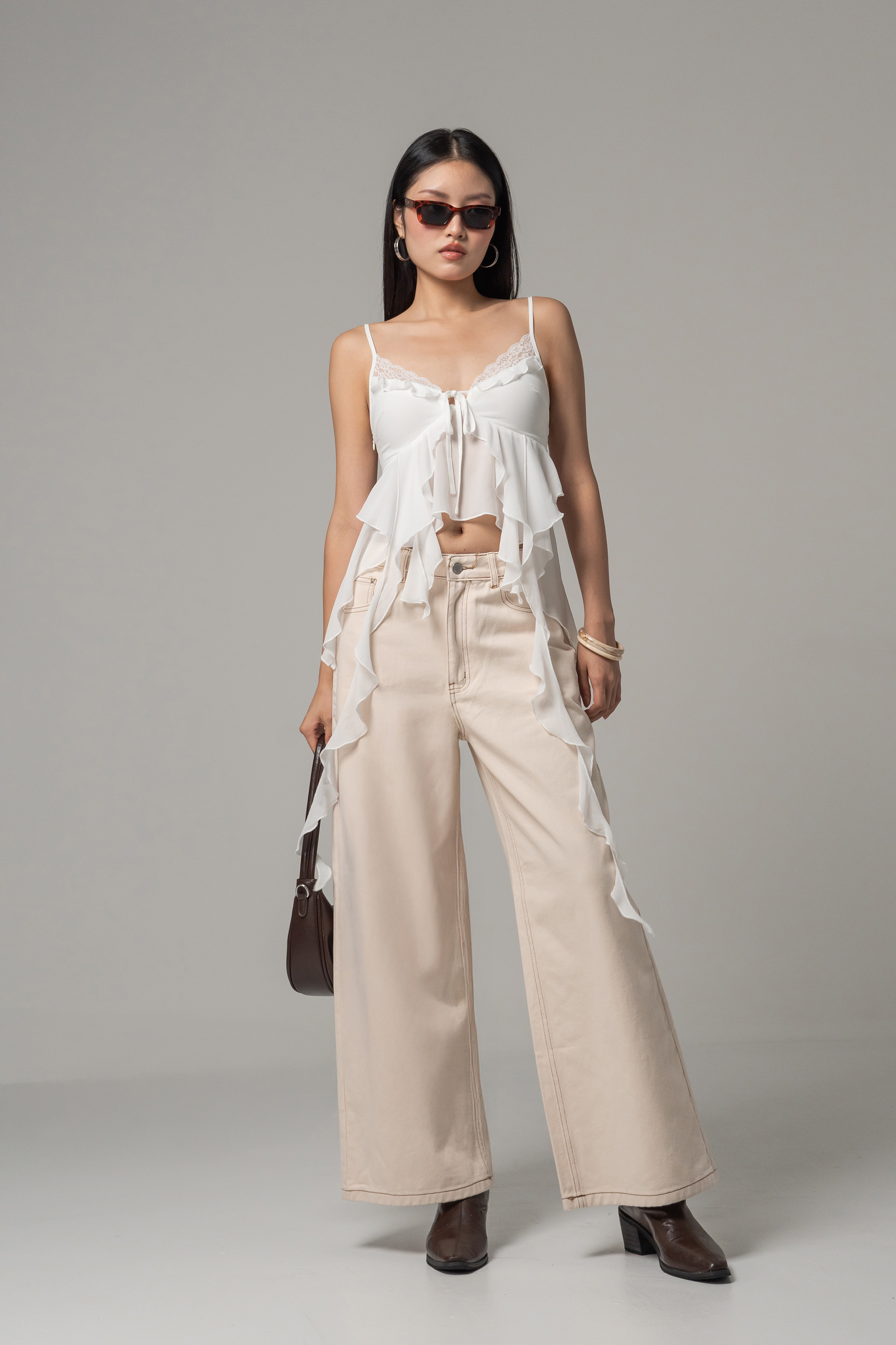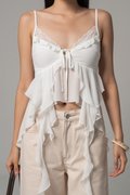 Sweet and playful, the Tides Ruffle Layered Top features thin straps, a front tie ribbon, and layered ruffles in a cropped silhouette. Light padding gives subtle support while keeping the fit effortless. Perfect for casual weekends, sunny holidays, and beachside strolls.