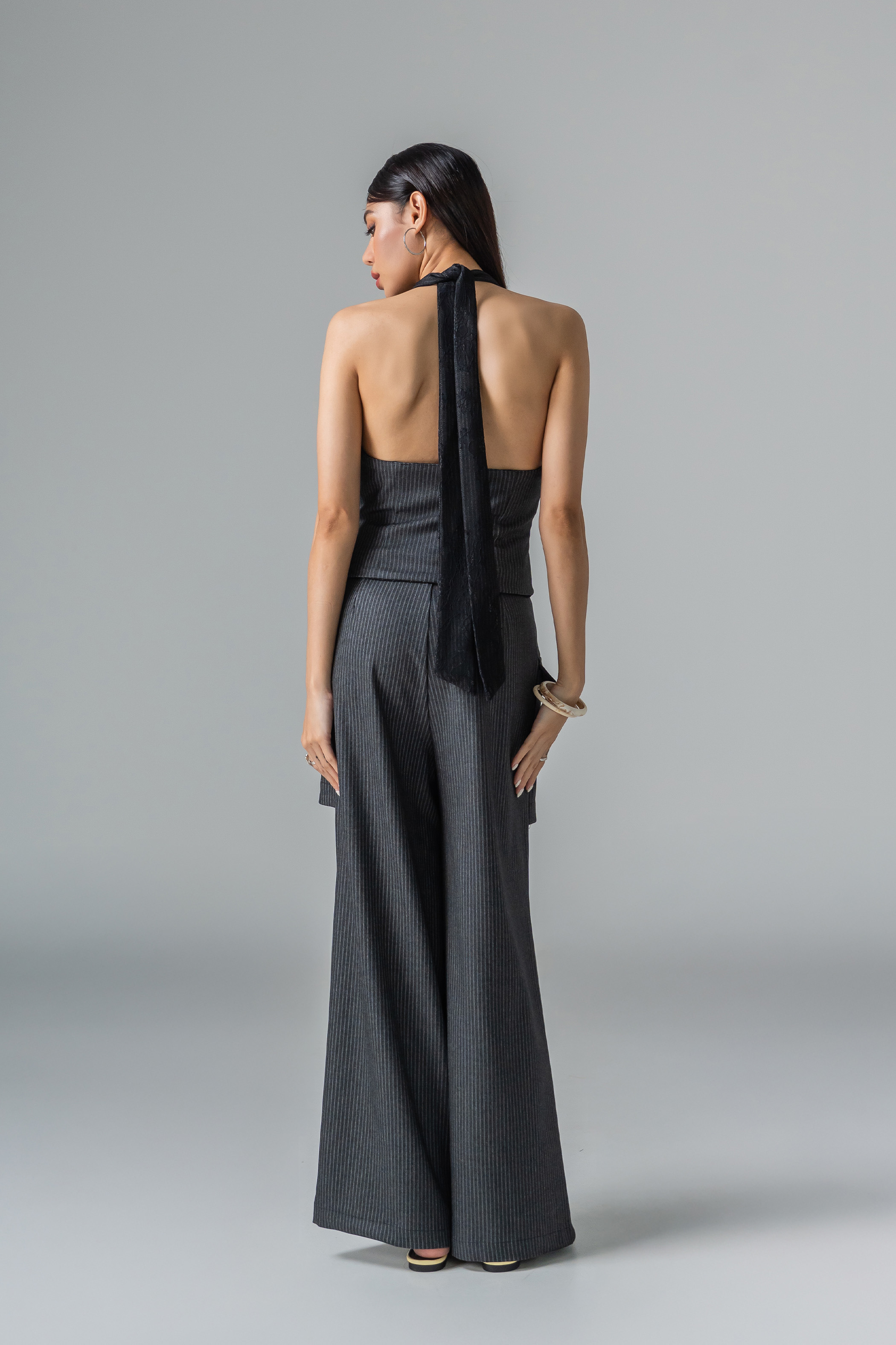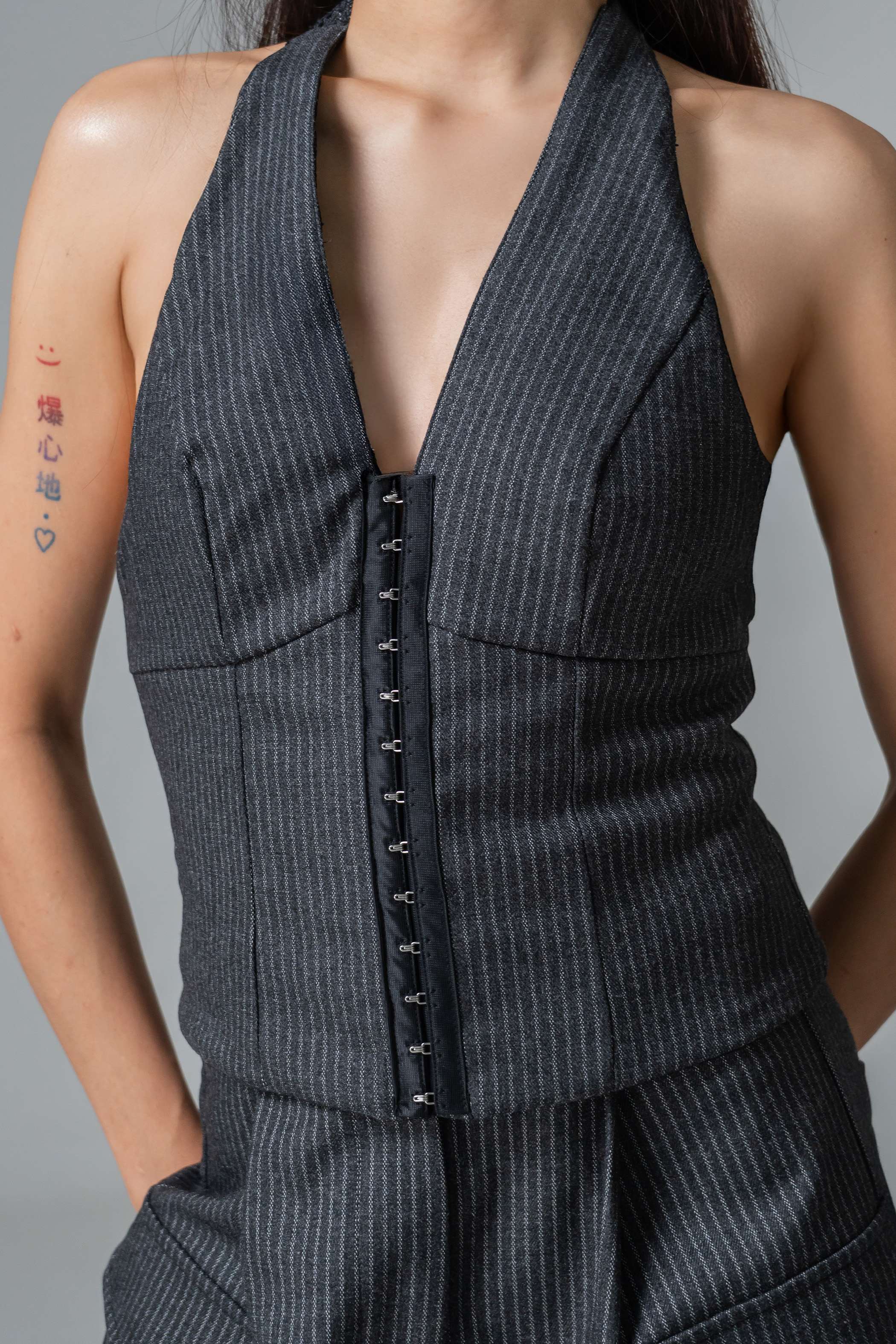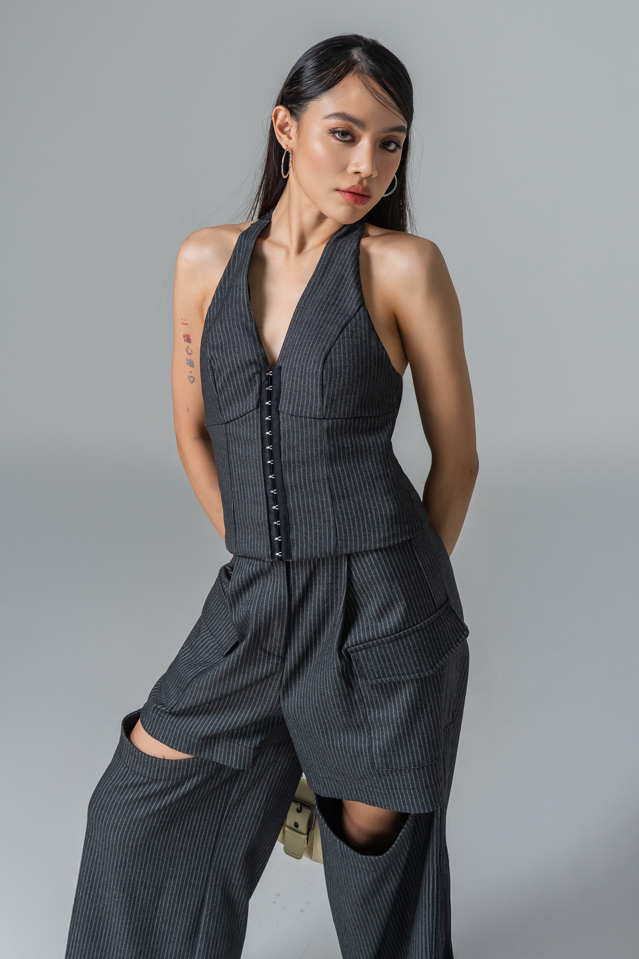 A top that shifts with your mood, designed to be worn inside out for two distinct looks — one in sleek pinstripe, the other layered with delicate lace. With padding and subtle structure, it shapes your silhouette with quiet confidence. A versatile piece that turns simple moments into something unforgettable.